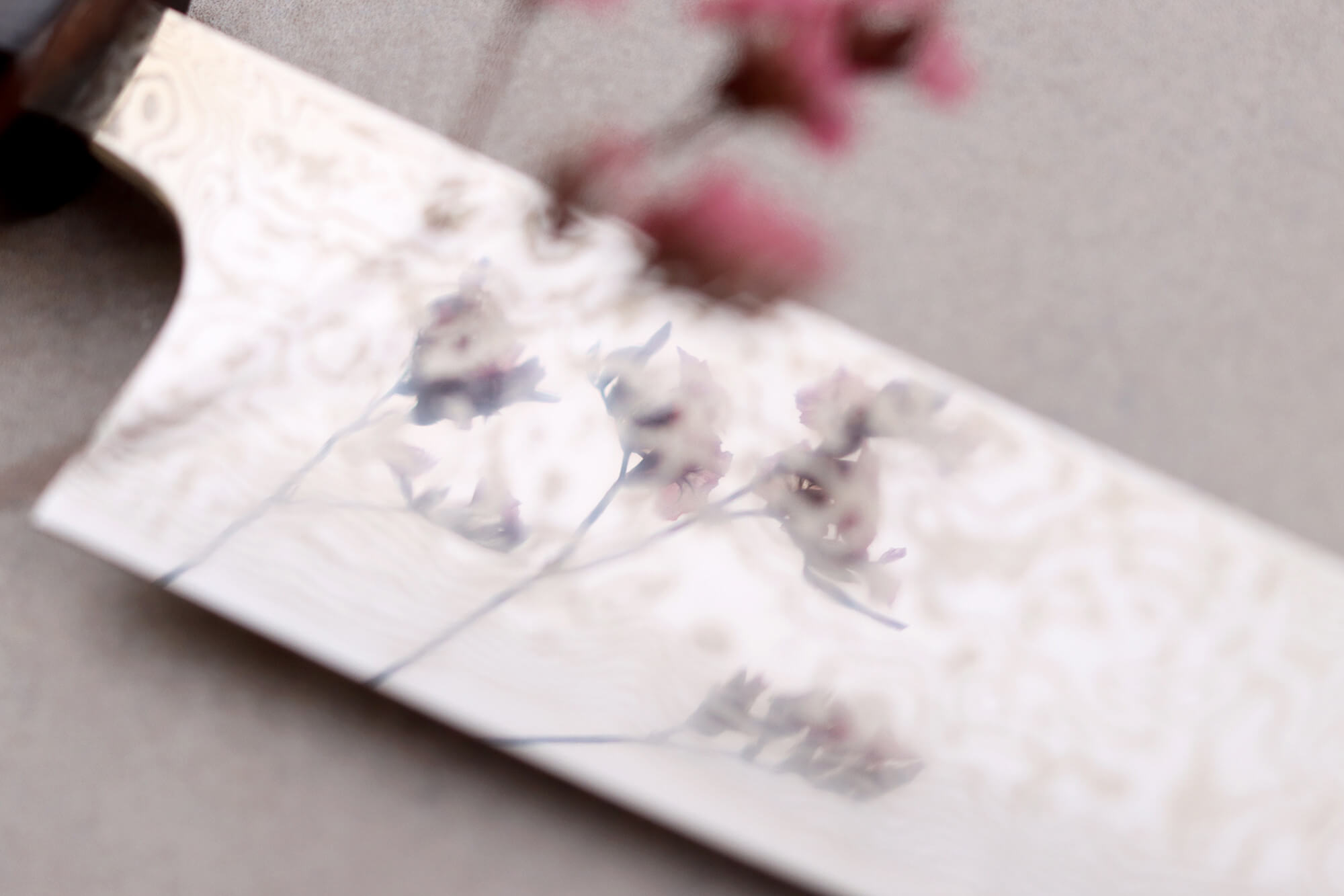 Votre couteau de cuisine japonais est muni d'une lame damassée. Cela veut dire qu'elle se compose d'un cœur rigide qui est ensuite entouré de plusieurs couches d'acier plus doux qui s'alternent et viennent équilibrer le cœur. Les couches apportent un peu plus de souplesse au noyau pour le protéger et le rendre moins cassant à l'usage.