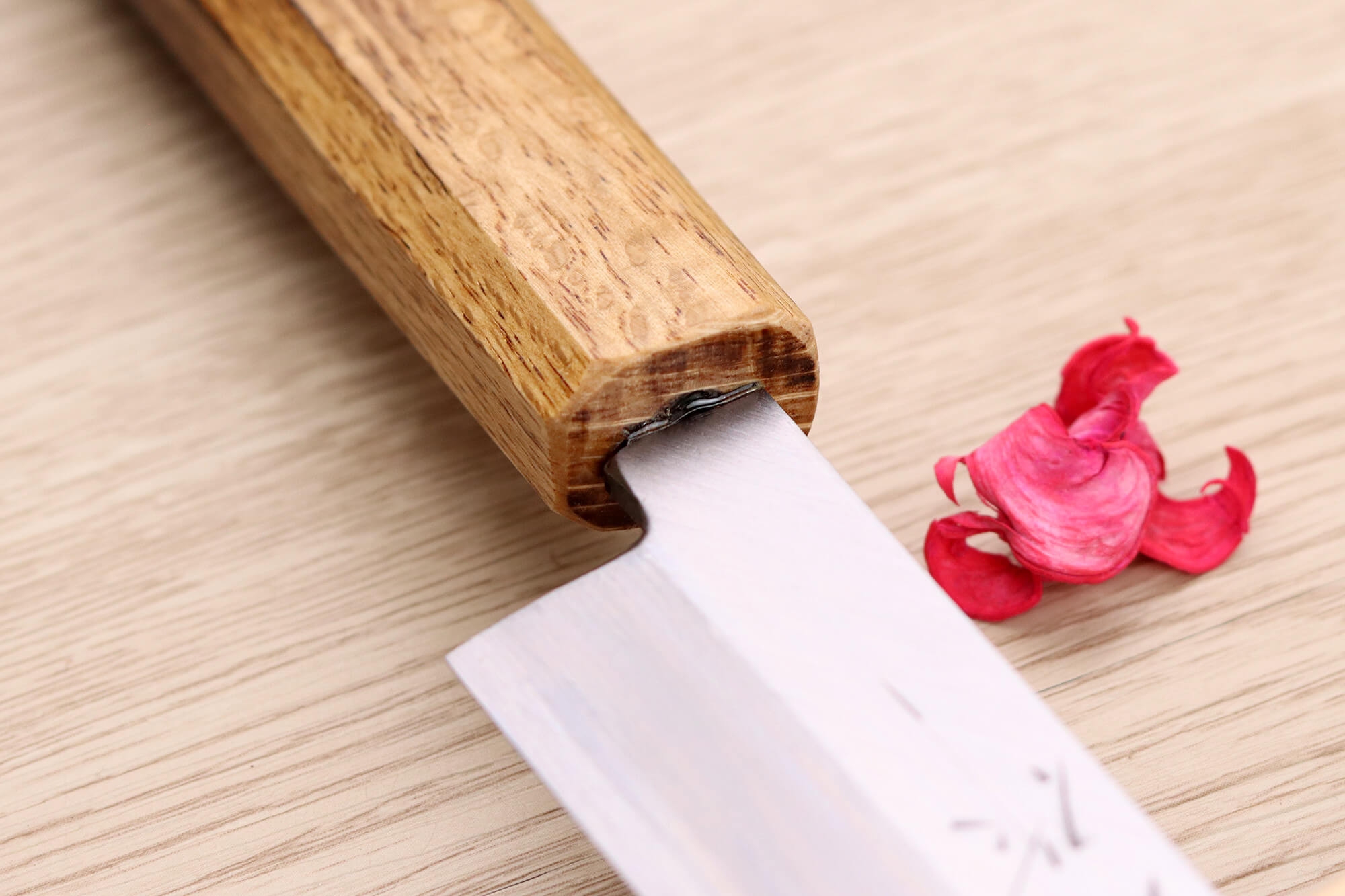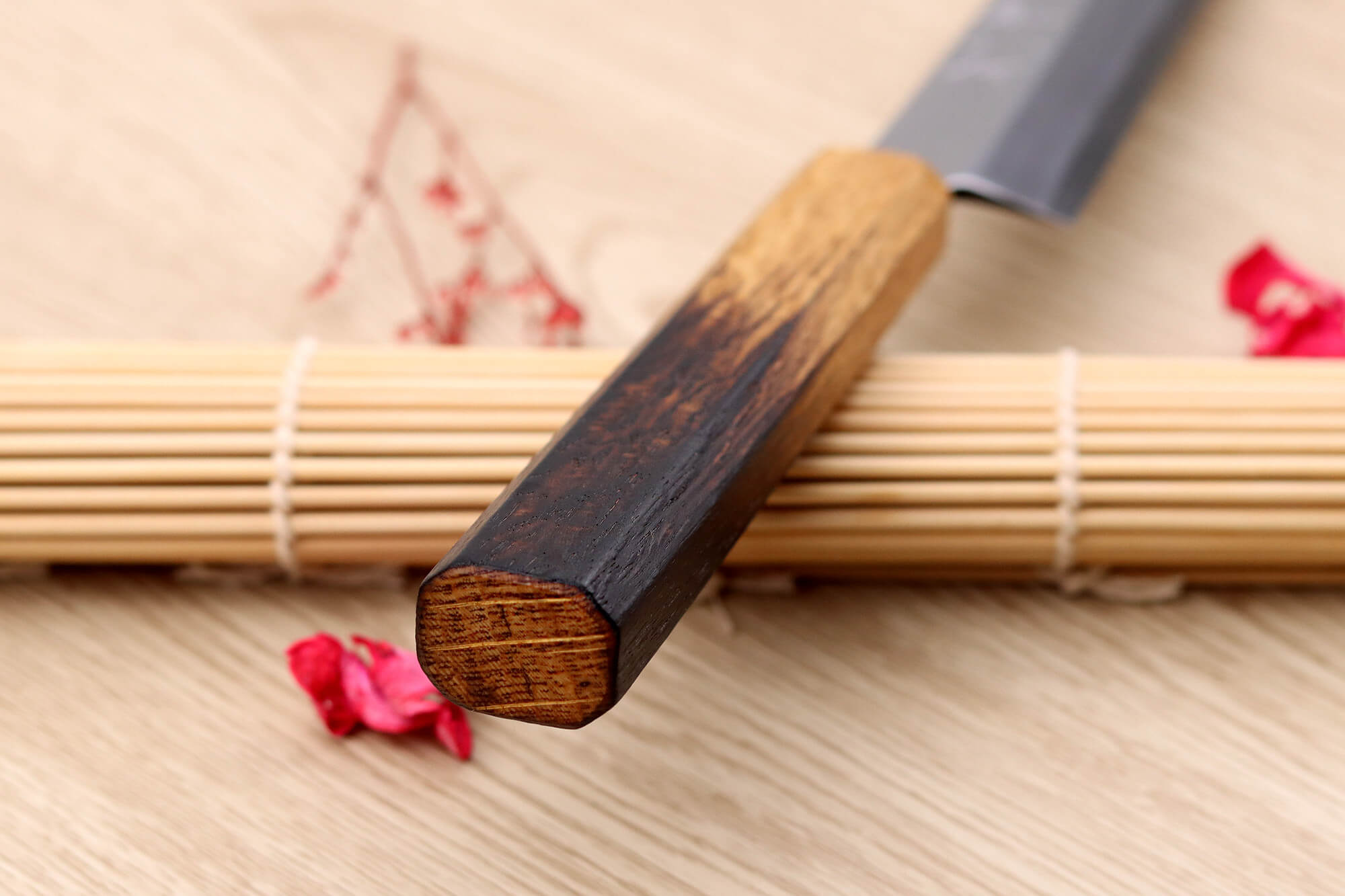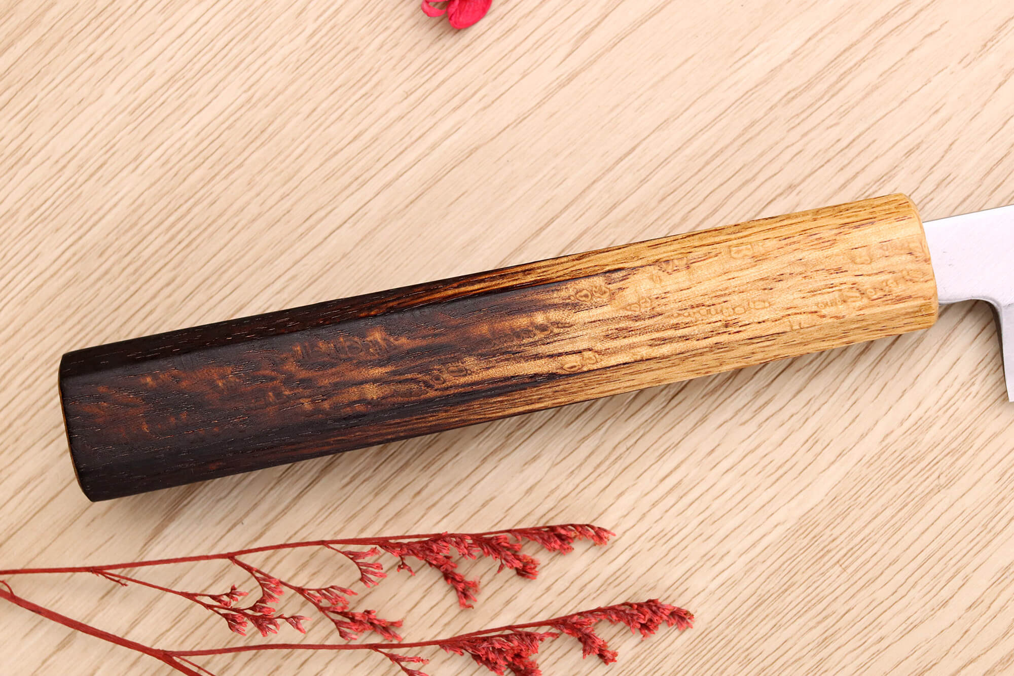 Le manche de votre couteau Nakamura est fabriqué en bois de chêne, une essence robuste et durable. Ce bois présente une densité élevée pour une meilleure résistance face à l'humidité, aux chocs et aux déformations. L'extrémité du manche a été brûlé pour donner du caractère à votre couteau Kashin Saku, cela lui confère aussi plus de solidité !
