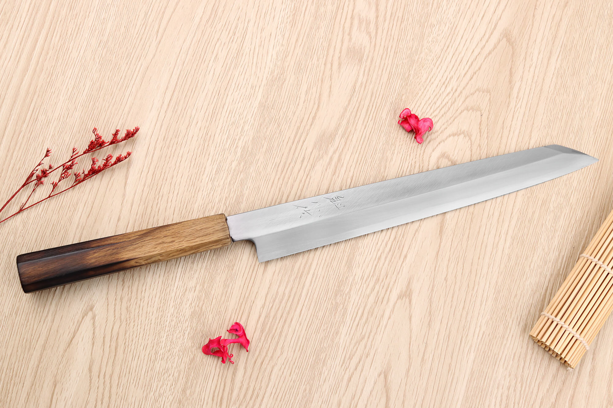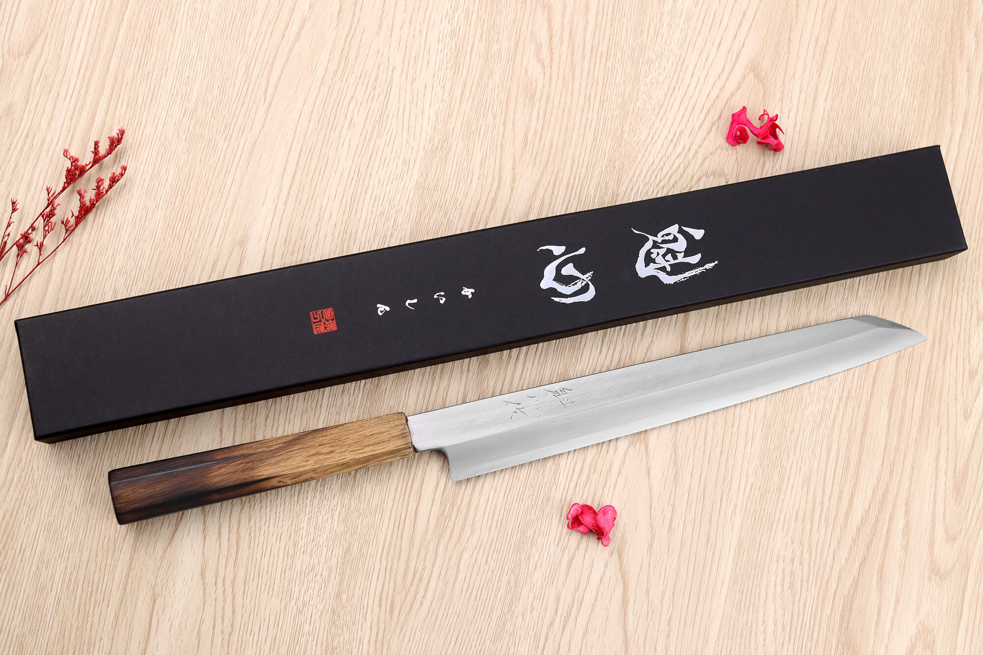 Ce yanagiba est forgé avec soin par une équipe de forgerons expérimentés, avant d’être affûté par Tomoyuki Ajioka, maître affûteur traditionnel de Sakai. Avec plus de cinquante ans d’expérience, il a formé de nombreux apprentis pour transmettre l’héritage de la coutellerie japonaise. Son approche consiste à affûter chaque lame en tenant compte des besoins de l’utilisateur, assurant ainsi une coupe nette et sans effort pour préserver la qualité des aliments !