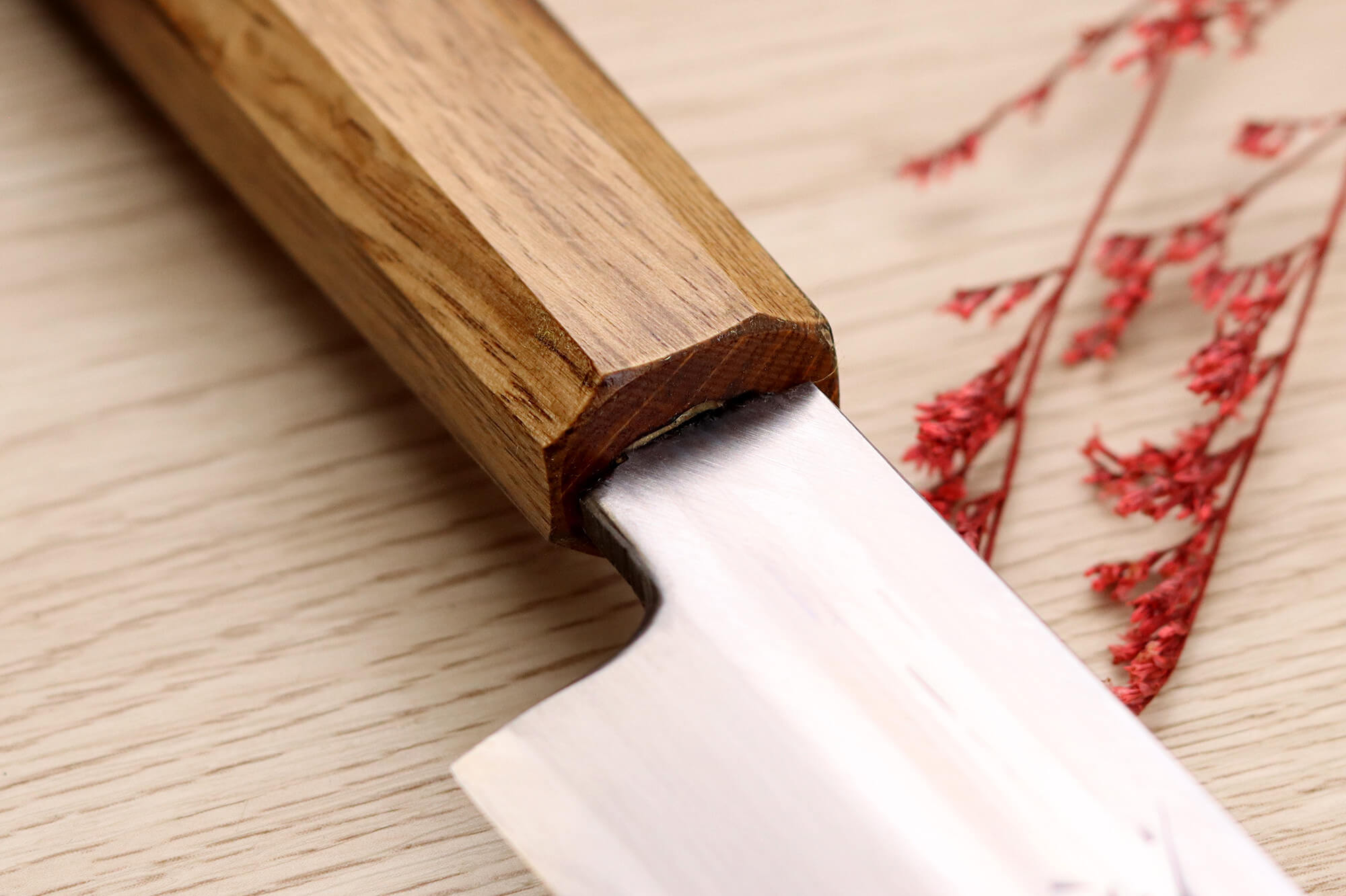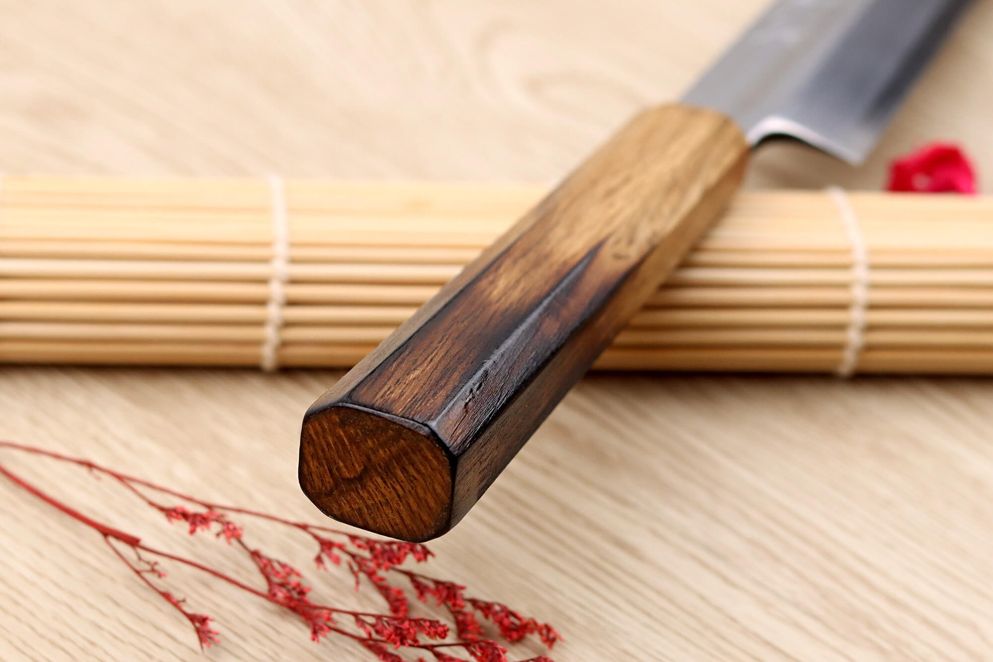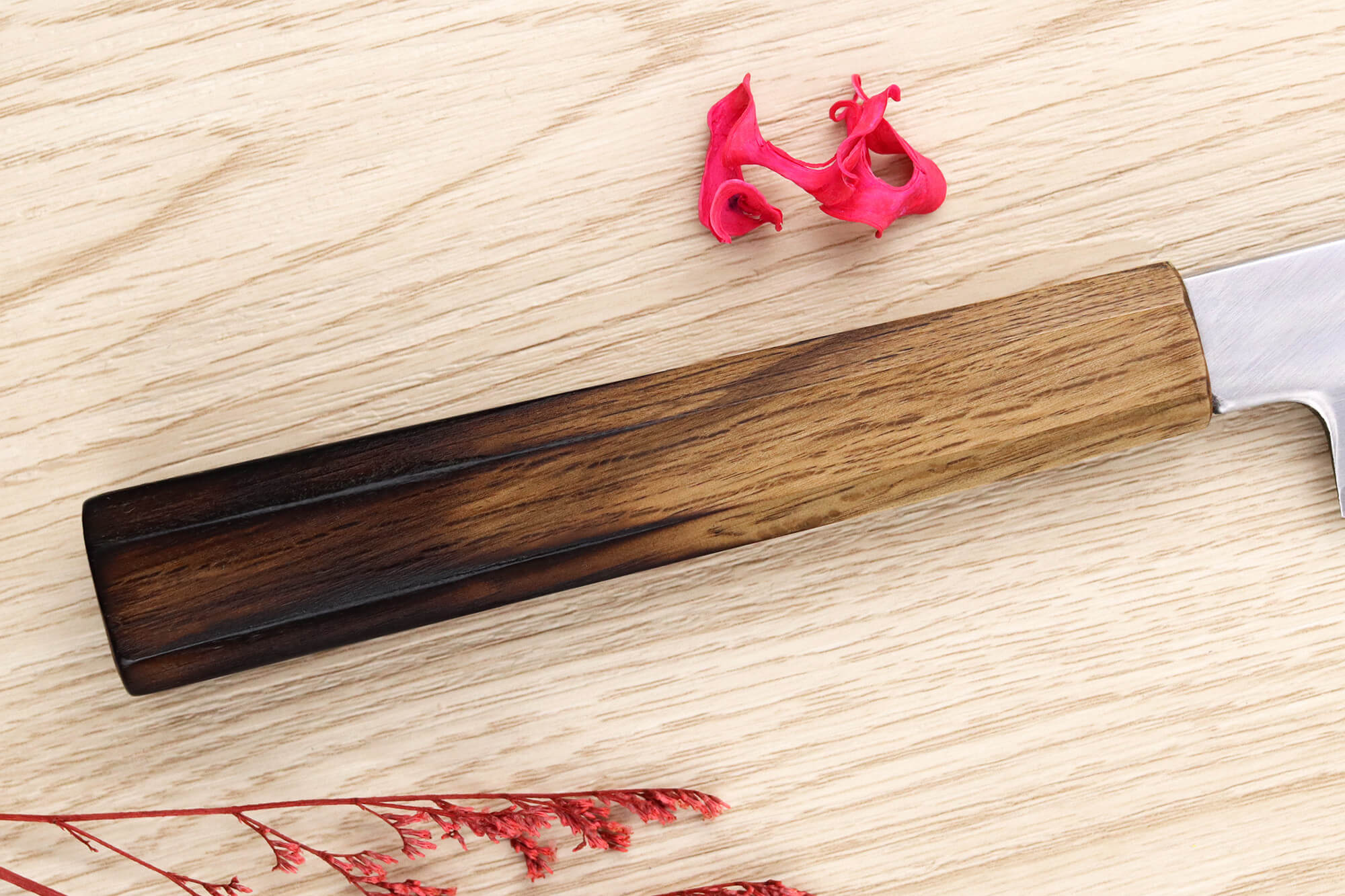 Le manche de ce couteau Nakamura est conçu en bois de chêne, une essence reconnue pour sa solidité et sa durabilité. Grâce à sa densité élevée, ce bois résiste efficacement à l’humidité, aux chocs et aux déformations. Son extrémité a été légèrement brûlée, un traitement qui lui confère une allure distinctive tout en renforçant sa robustesse !