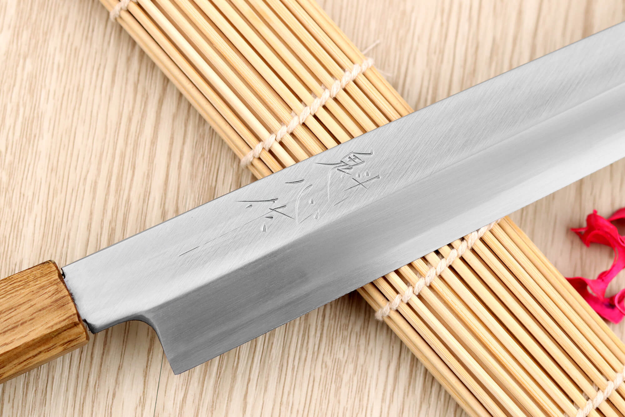 La finition traditionnelle Kasumi, signifiant "brumeux" en japonais, magnifie la lame avec un polissage à l’argile qui lui donne un aspect satiné et élégant. Enfin, des kanjis gravés à la main viennent ajouter une touche artisanale et unique à ce couteau de cuisine japonais.
