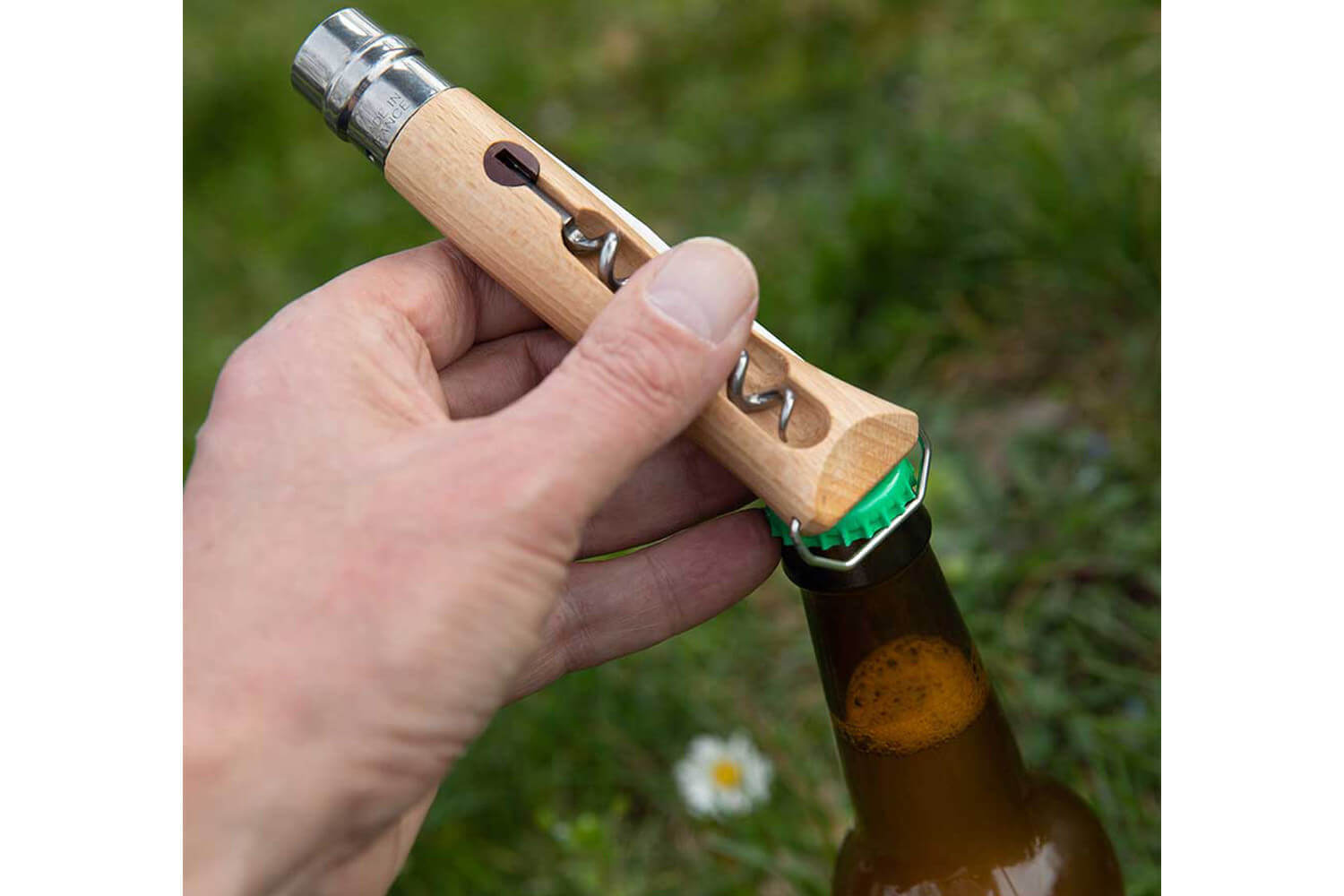 Un décapsuleur se trouve également à l'extrémité du manche. Présenté sous la forme d'un anneau en acier inoxydable, il est solide et ouvre efficacement bouteilles de bières, cidres et toutes autres bouteilles à capsules.