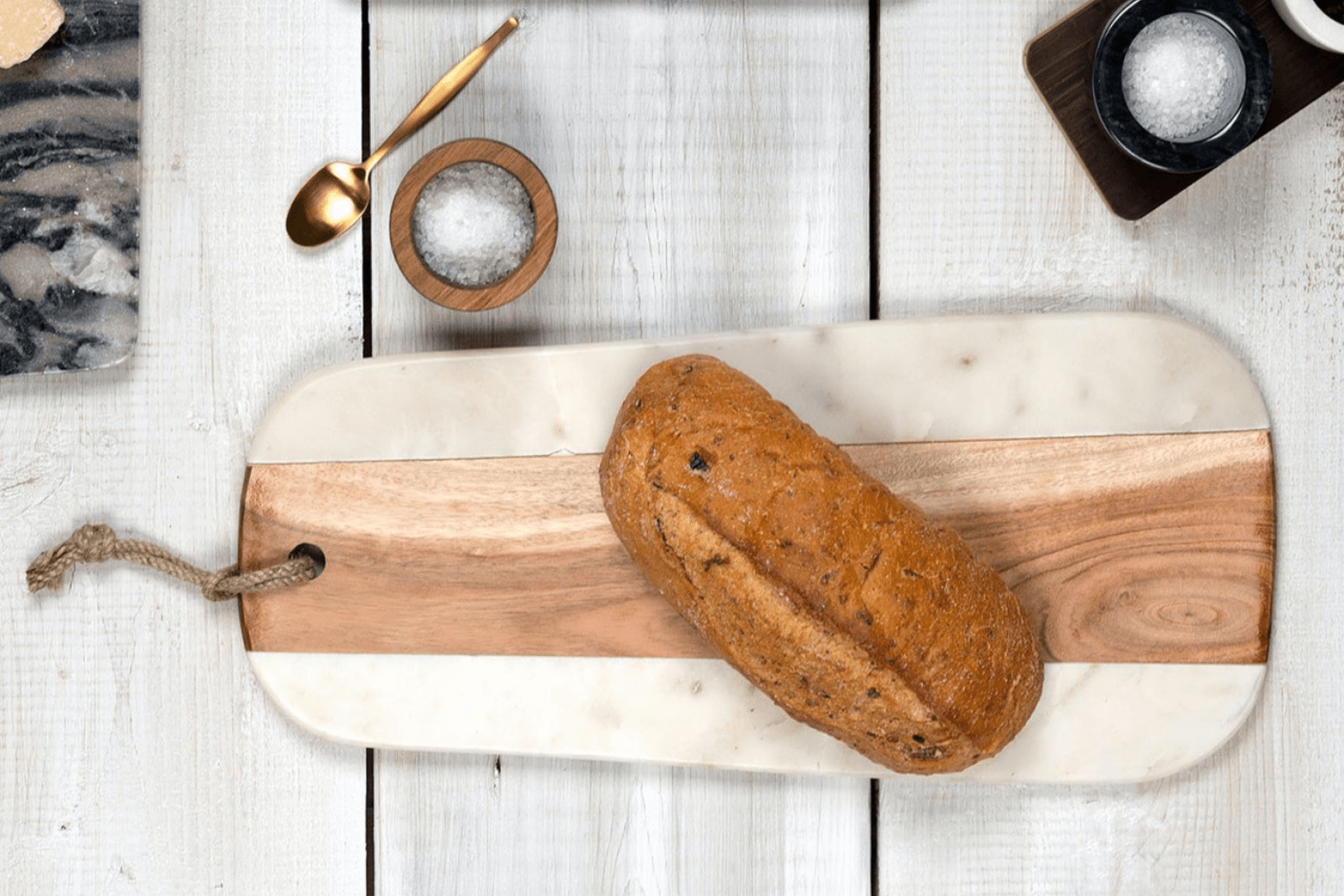 Fabriquée en marbre blanc et bois d'acacia : élégant et durable