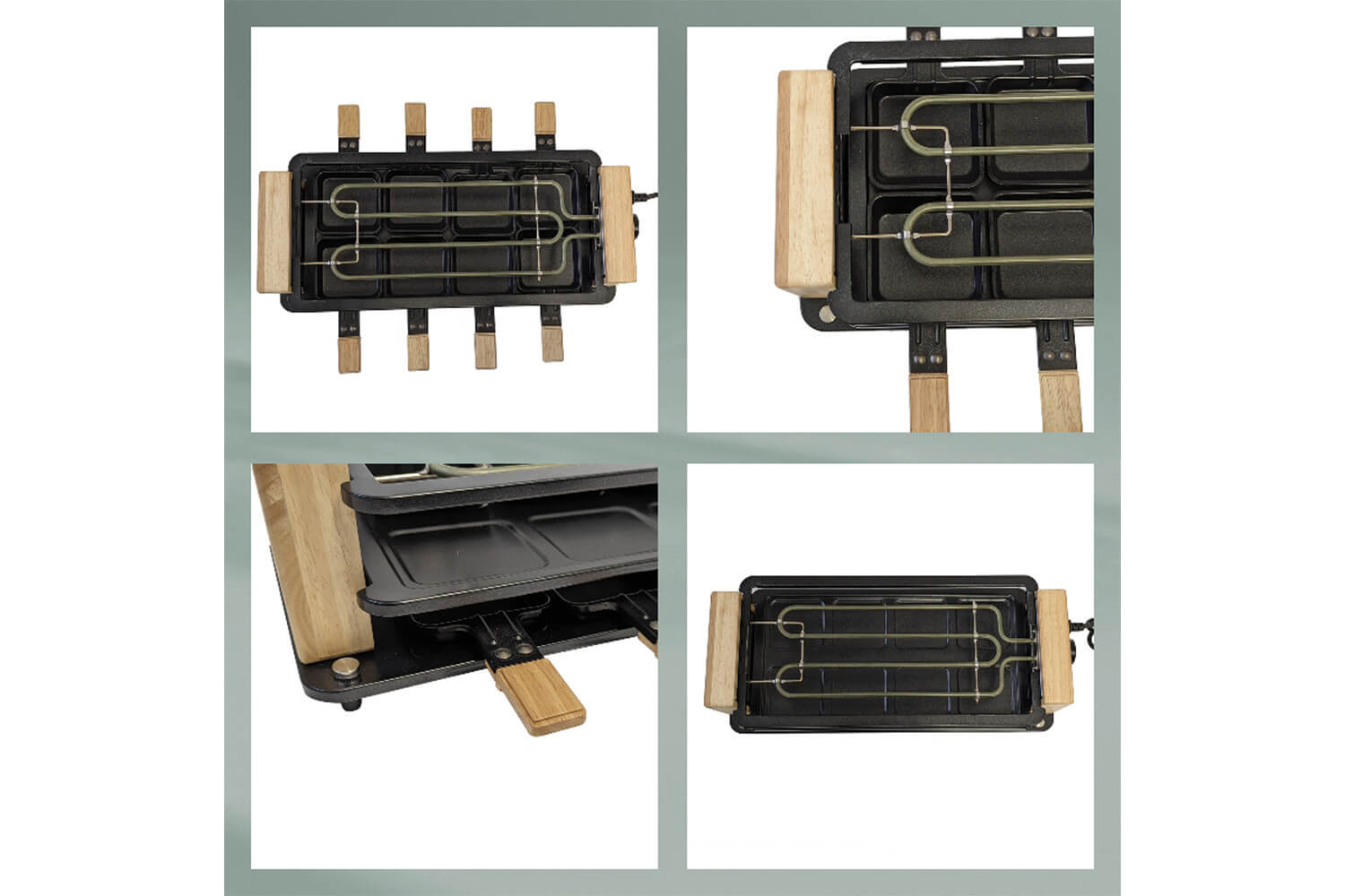 Ses dimensions de 49 x 20 x 12,5 cm en font un appareil confortable pour 8 personnes. La plaque de cuisson accueille poissons, viandes ou légumes sans surcharge, pendant que chaque convive fait fondre son fromage à son rythme.