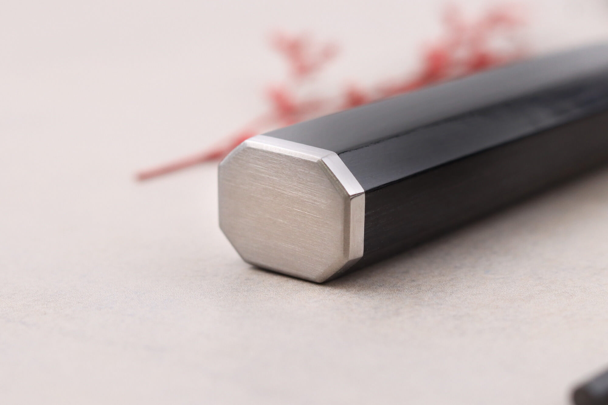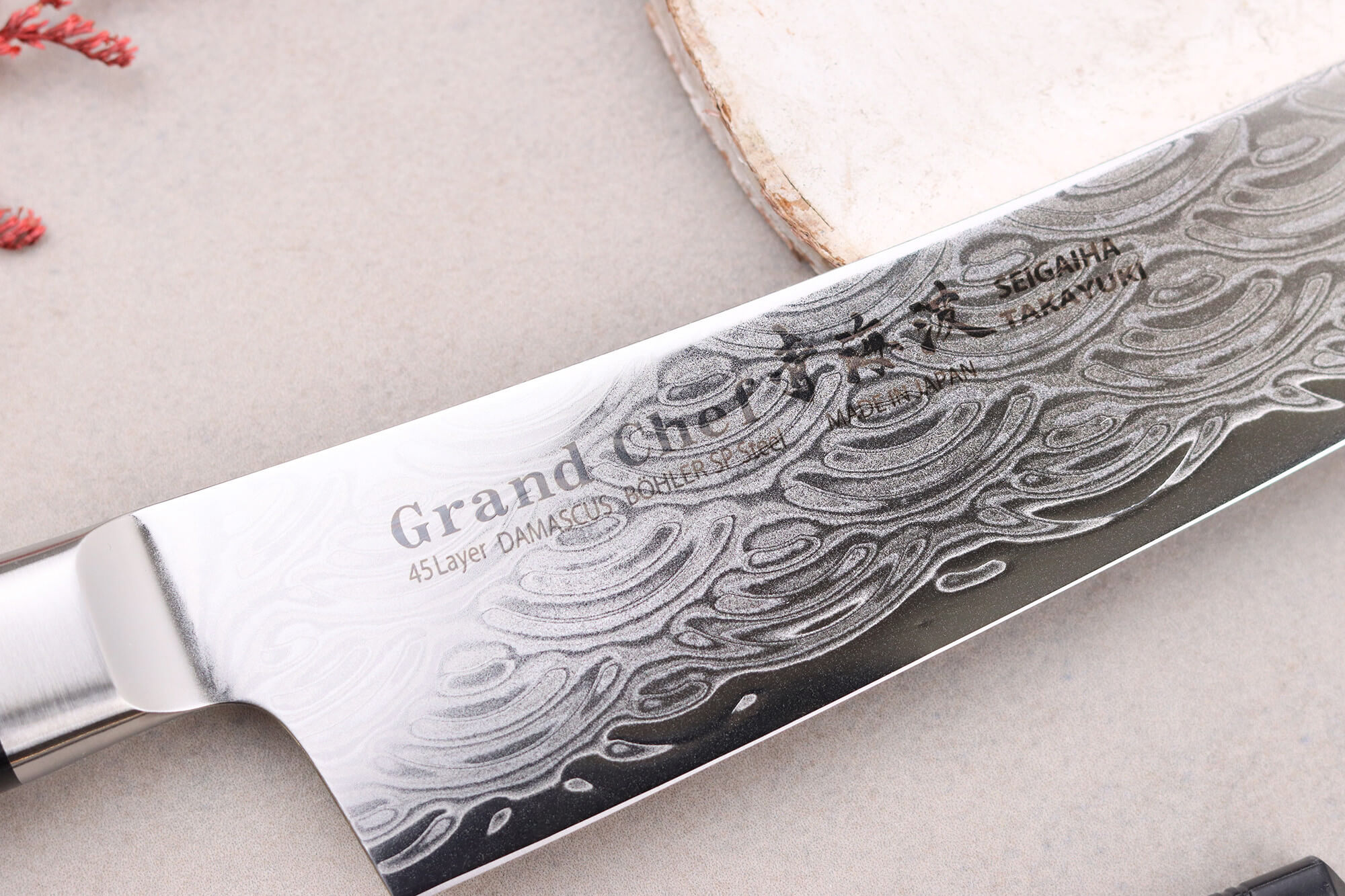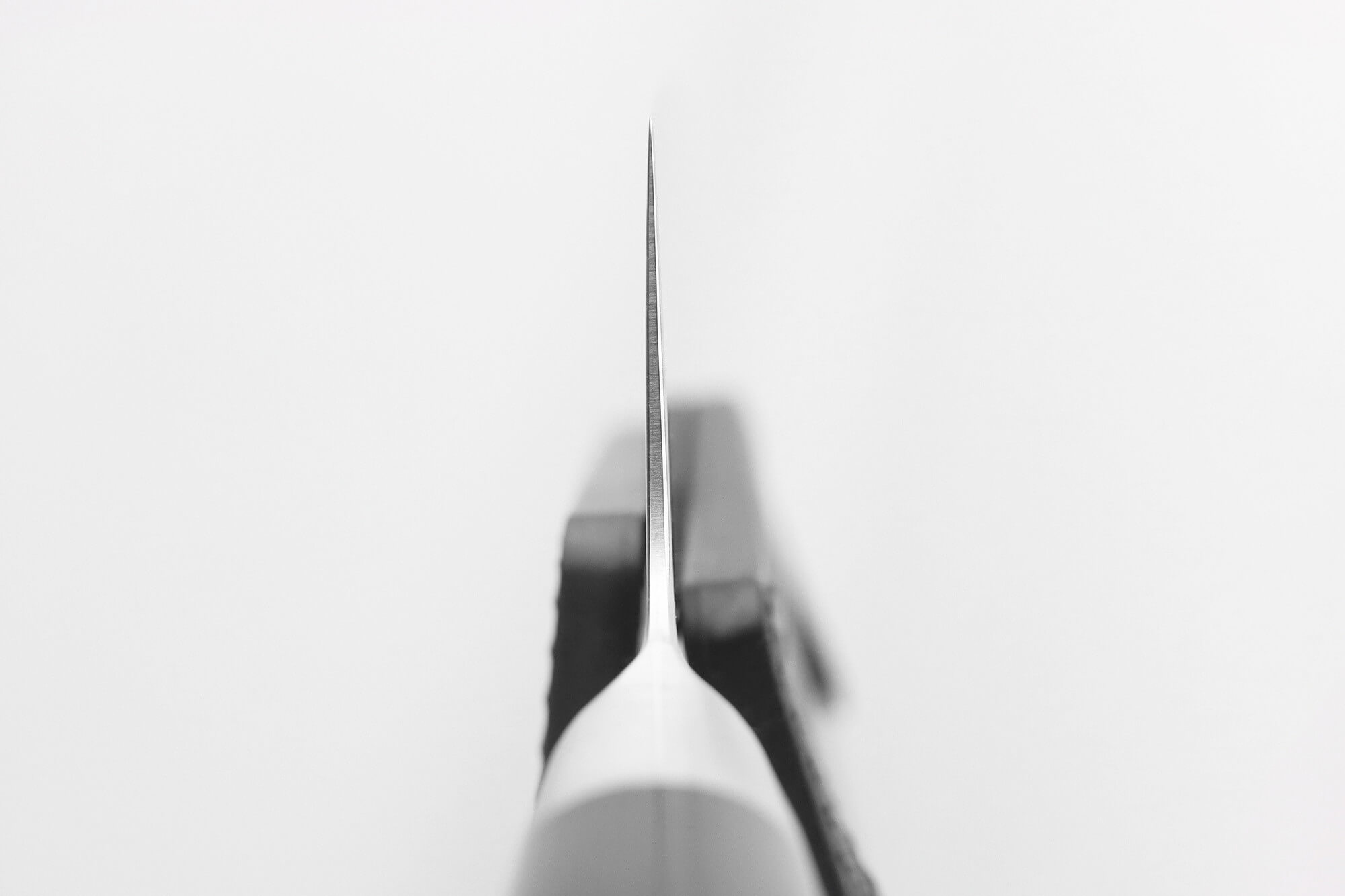L’émouture plate de la lame assure une découpe nette et précise. La lame atteint une dureté d'environ 60 HRC sur l'échelle de Rockwell, ce qui lui assure une excellente tenue du tranchant dans le temps. La finition miroir sublime le motif Seigaiha tout en facilitant la glisse sur les aliments.