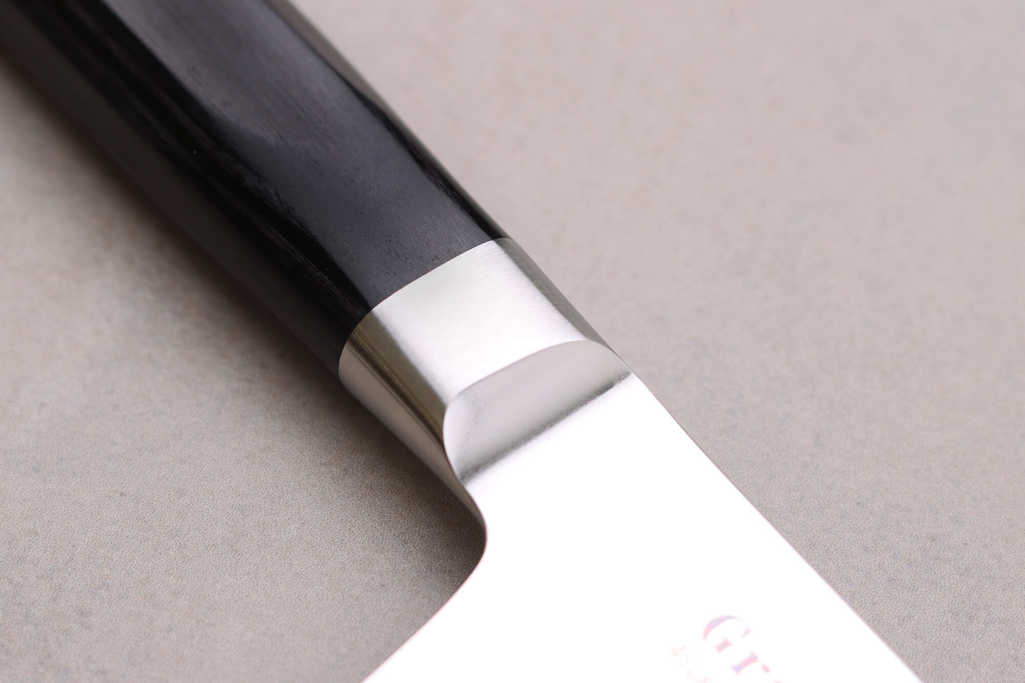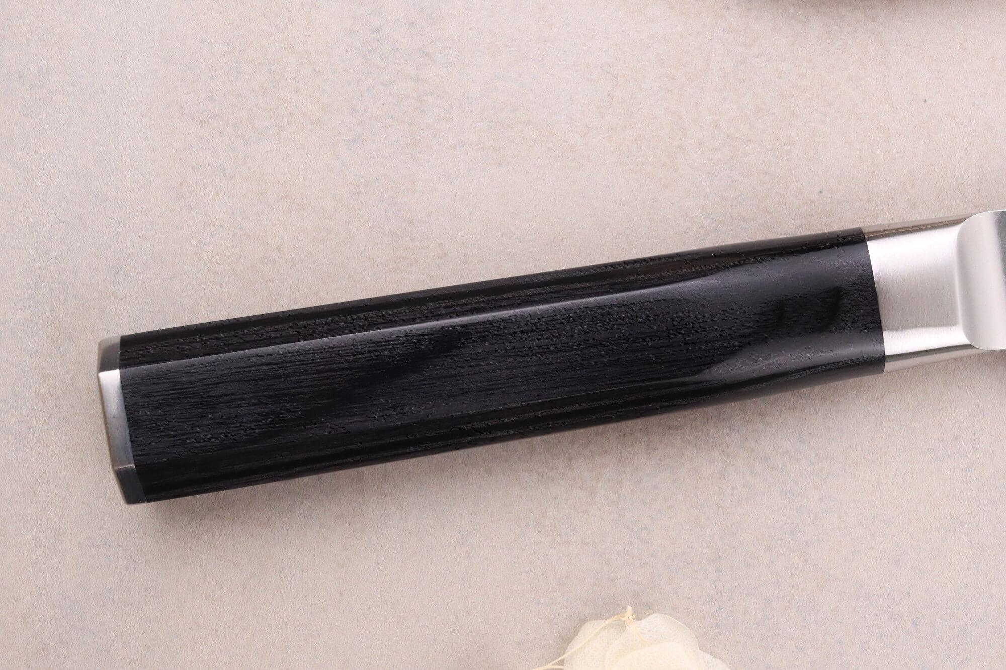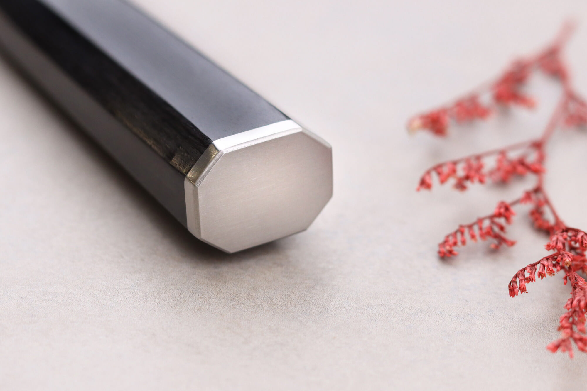 Une mitre et un talon en acier inoxydable complètent le manche, lui apportant de la robustesse et un équilibre optimal dans la main. Cela rend l’utilisation fluide, confortable, même pendant les longues sessions de découpe.