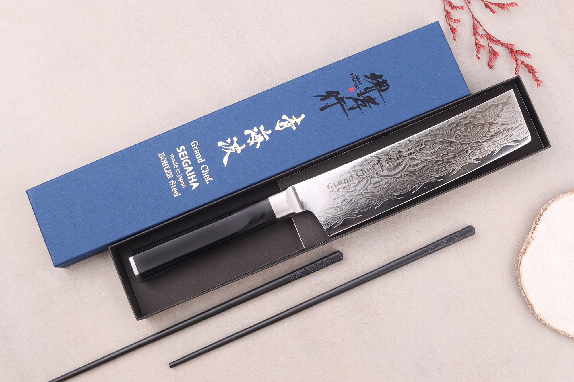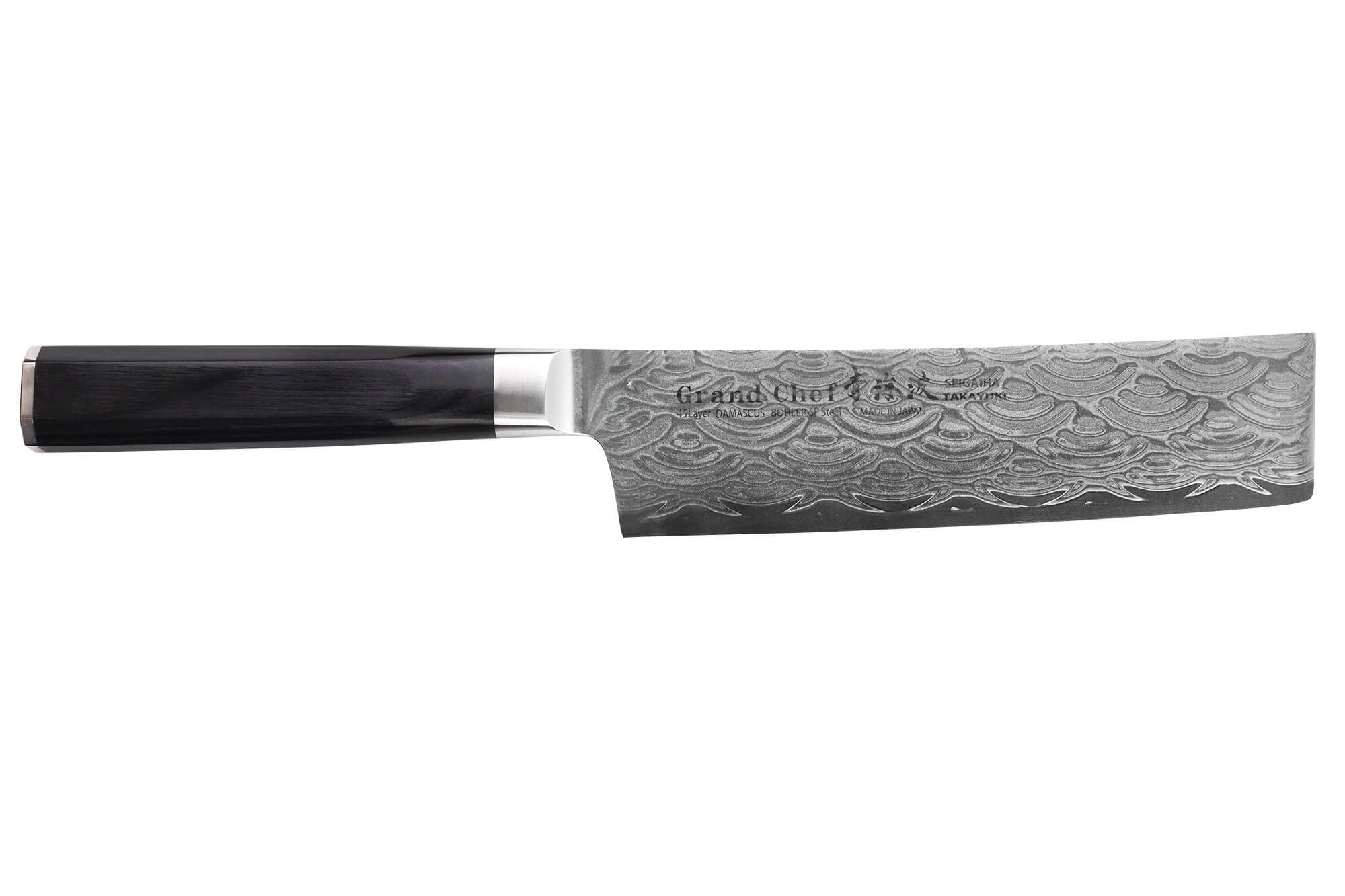 Ce couteau damas nakiri Grand Chef Seigaiha de 16cm est le modèle idéal pour tous les amateurs de légumes. Il a été fabriqué à Seki, berceau de la coutellerie japonaise moderne, et mêle design traditionnel, ingénierie de coupe et matériaux haut de gamme.