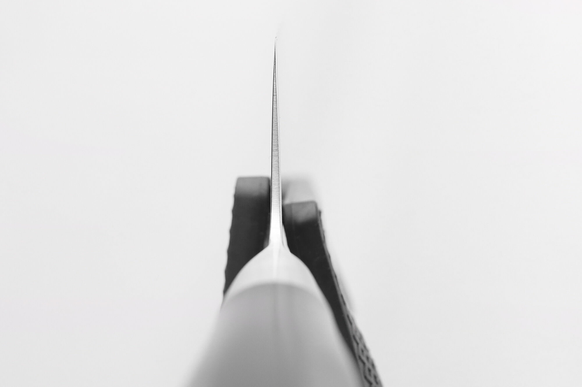L'émouture plate du fil renforce la finesse de coupe, et la dureté d'environ 60 HRC sur l’échelle de Rockwell garantit une excellente tenue du fil dans le temps. Un polissage miroir a été appliqué à la lame afin de sublimer le damas Seigaiha et d'assurer une surface totalement lisse. La lame glisse plus facilement sur les aliments.