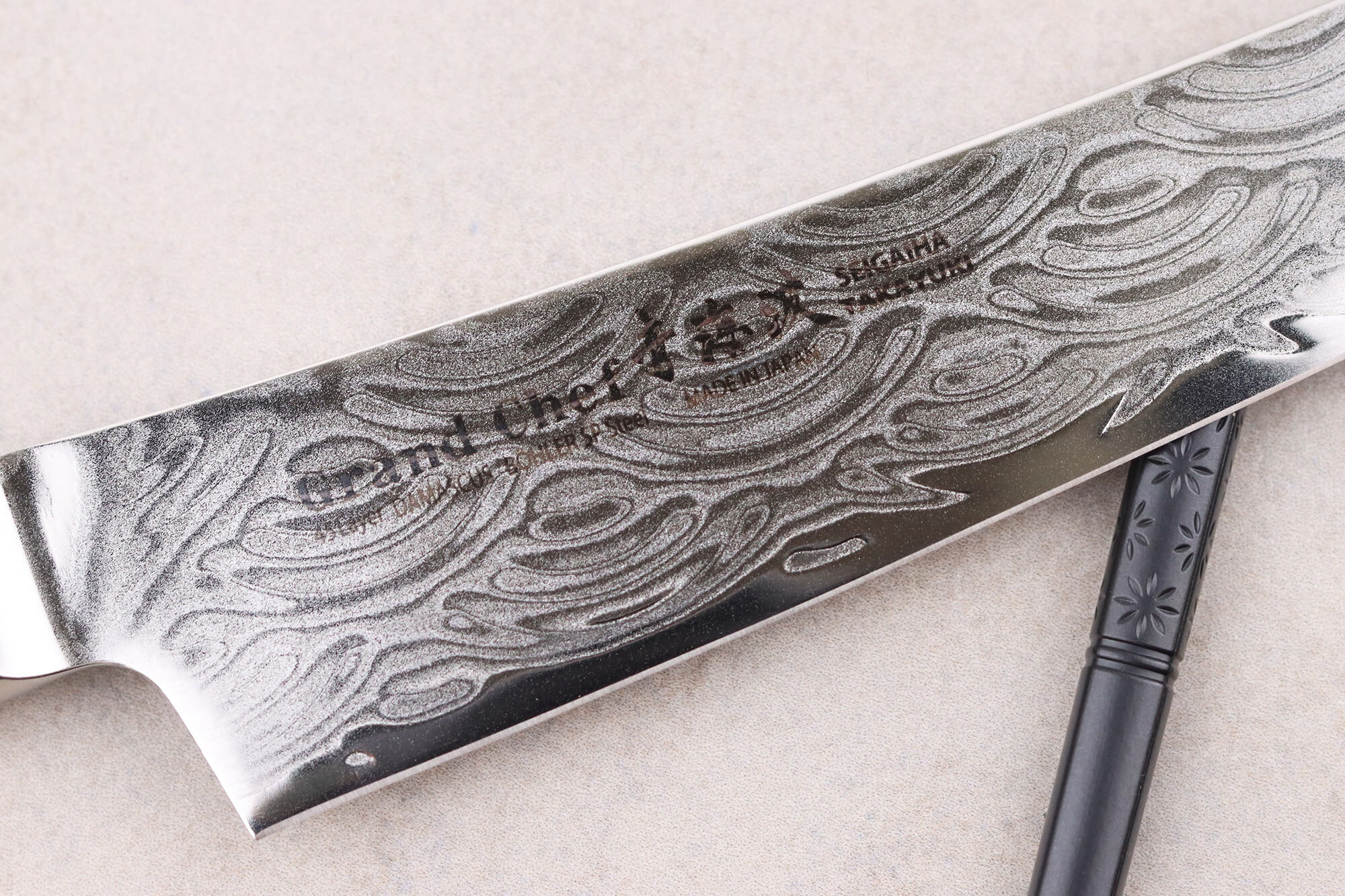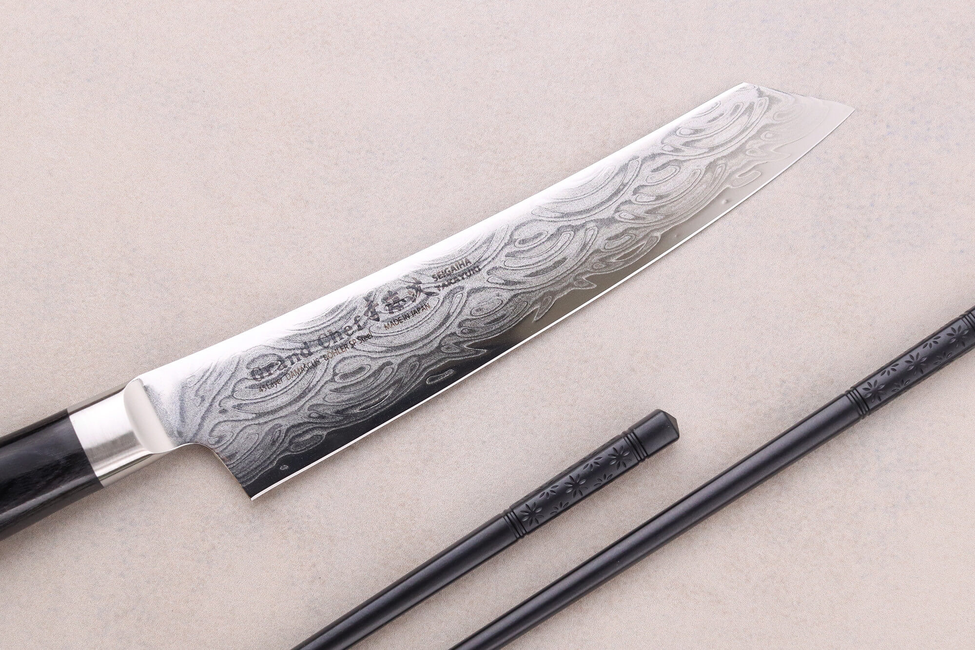 L’émouture plate du fil assure une coupe nette des aliments, et la dureté d’environ 60 HRC garantit une tenue du tranchant prolongée. La lame dispose d'un polissage miroir, ce qui met en valeur le motif Seigaiha tout en facilitant la glisse de la lame sur les aliments.