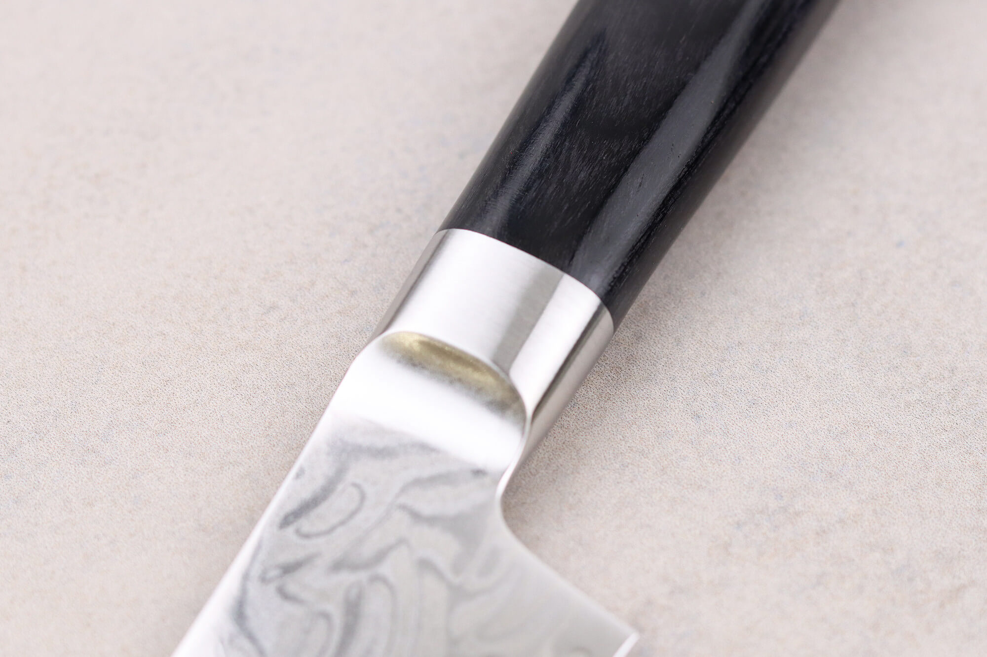 Le noyau de la lame est fait en acier inoxydable Böhler suédois, un alliage de haute qualité connu pour sa pureté, sa robustesse et sa résistance à la corrosion. Il est enveloppé de 44 couches d’acier inoxydable, ce qui forme un damas de 45 couches protégeant le noyau, tout en magnifiant la lame.