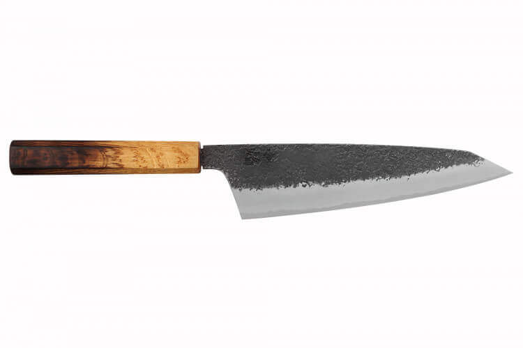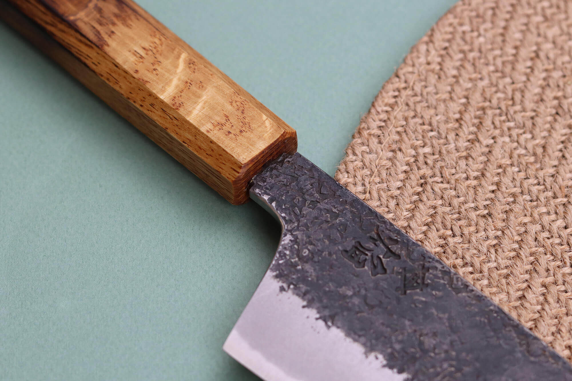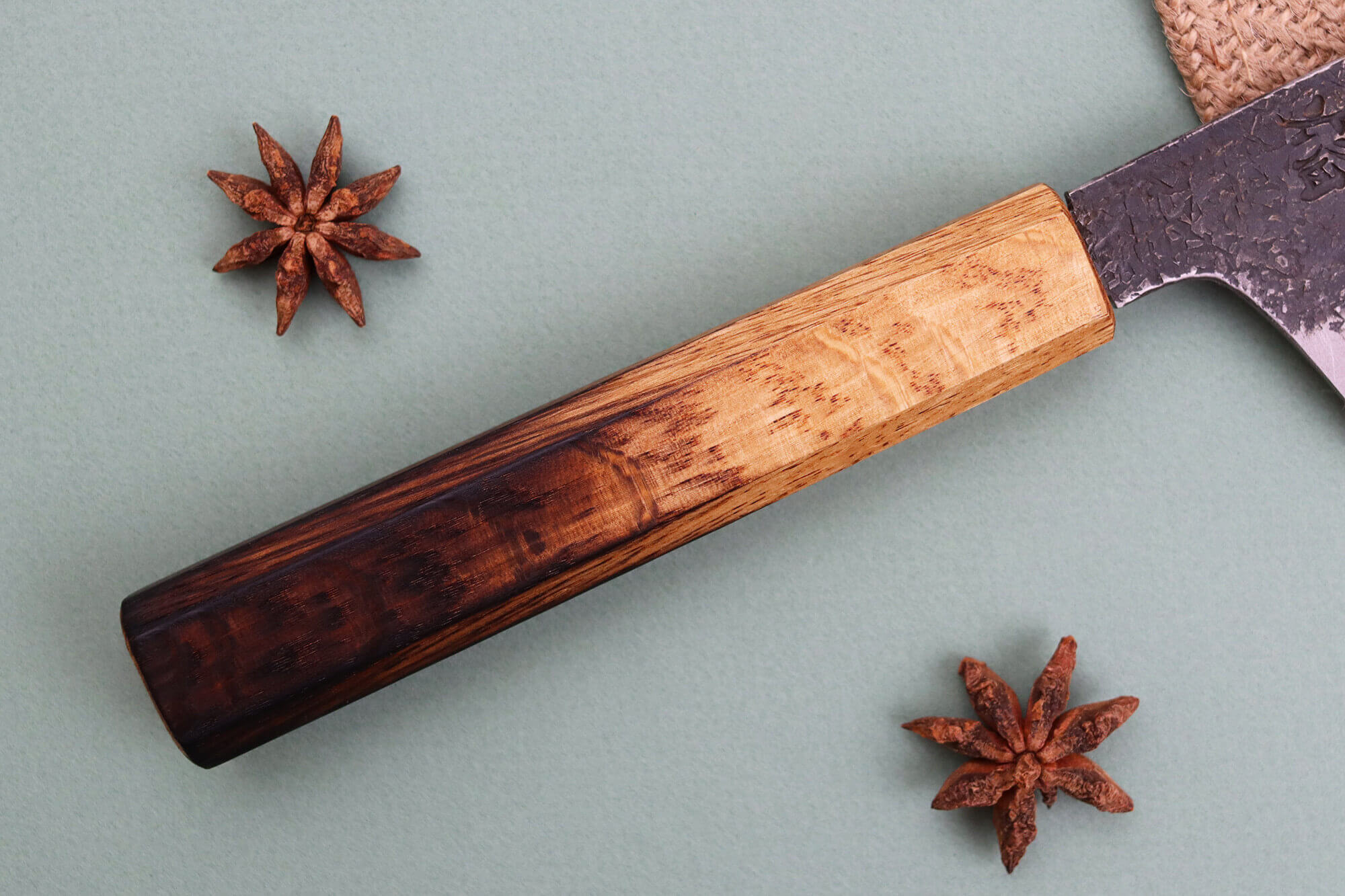 Le machi de ce couteau est apparent : on pourrait croire que la lame ne s'insère pas correctement dans le manche, mais ce n'est pas le cas ! C'est une tradition qui provient de Sakai afin de parfaire l'équilibre du couteau en jouant sur son centre de gravité.