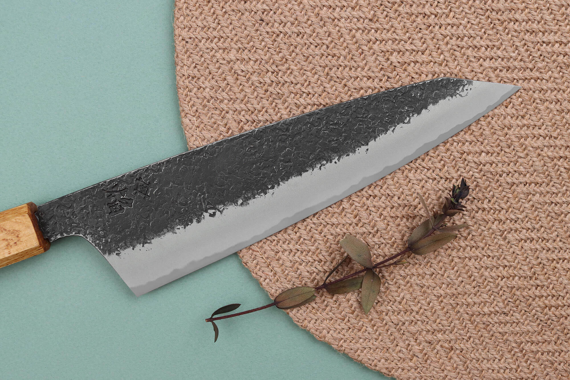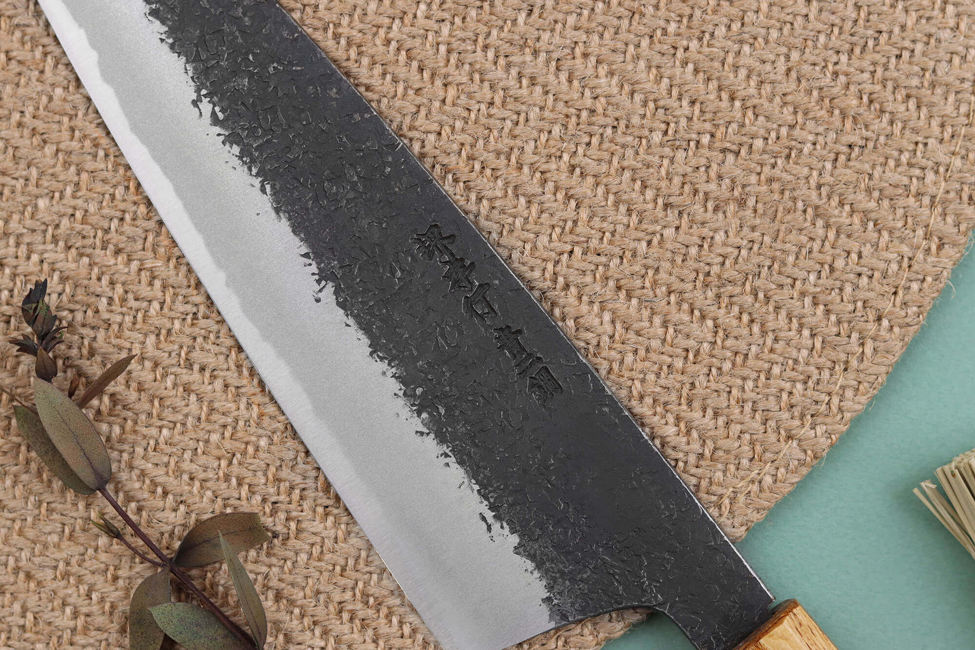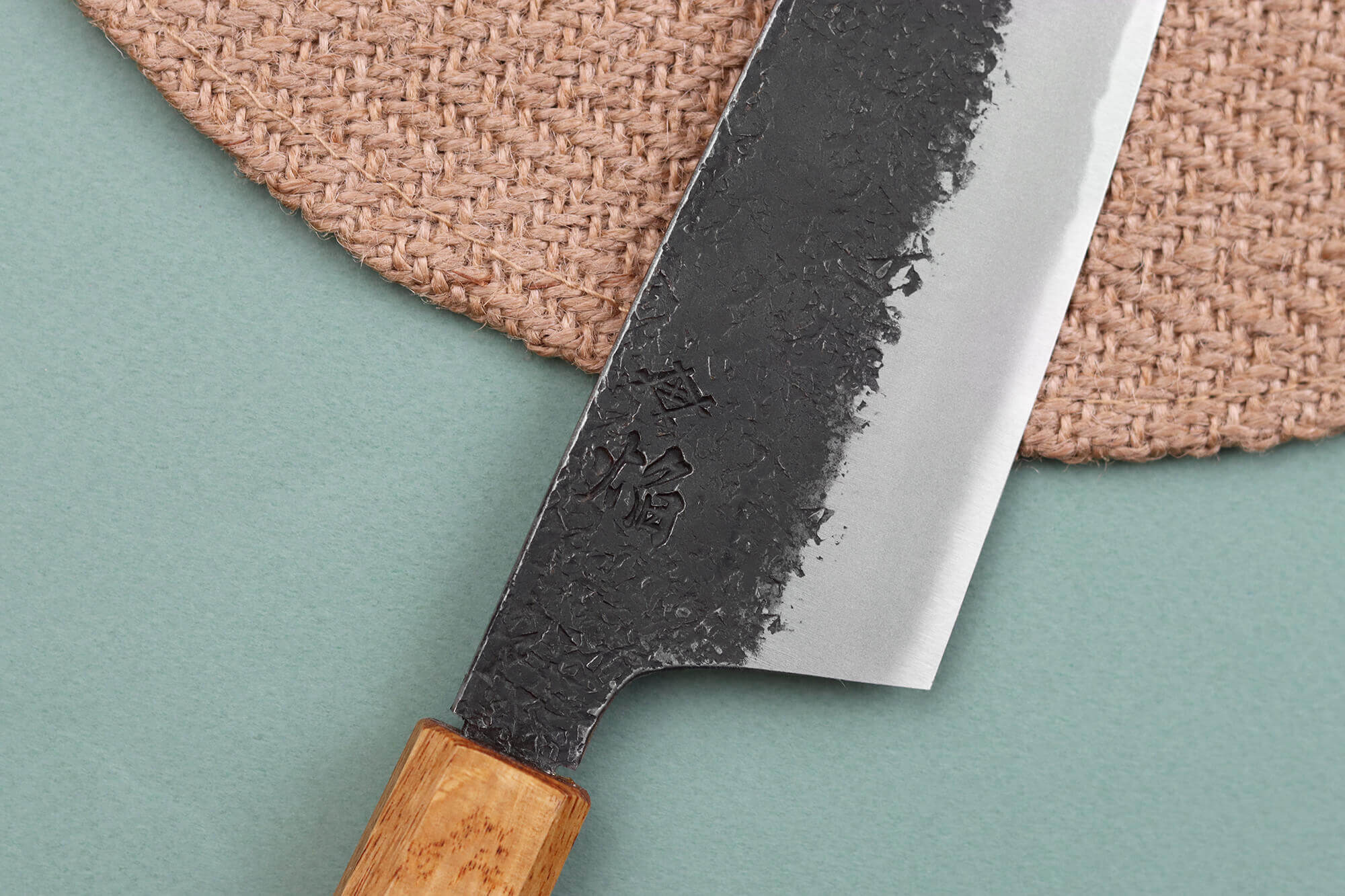La lame de votre couteau a été martelée et n'a pas été polie pour rester brute de forge. Cela donne un aspect authentique à votre couteau, représentatif du savoir-faire artisanal japonais. Des kanji ont été gravés à la main, l'un d'entre eux 焔 (Homura) veut dire "flamme" et fait référence au nom de la gamme.