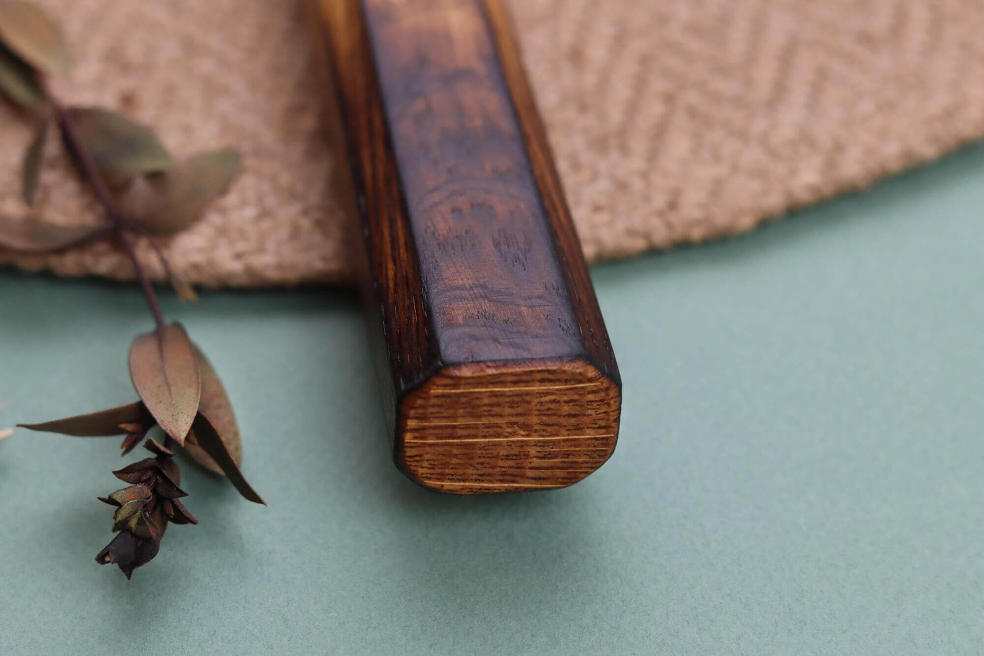 Le manche de votre couteau de chef est conçu en bois de chêne brûlé : c'est une essence durable qui est résistante aux chocs. Avec sa forte densité, c'est un bois qui ne se déforme pas facilement, même face aux vibrations. Pour ce couteau, le chêne a été brûlé à une extrémité pour créer du contraste avec la clarté du bois. De plus, cela permet de garantir plus de résistance à votre manche.