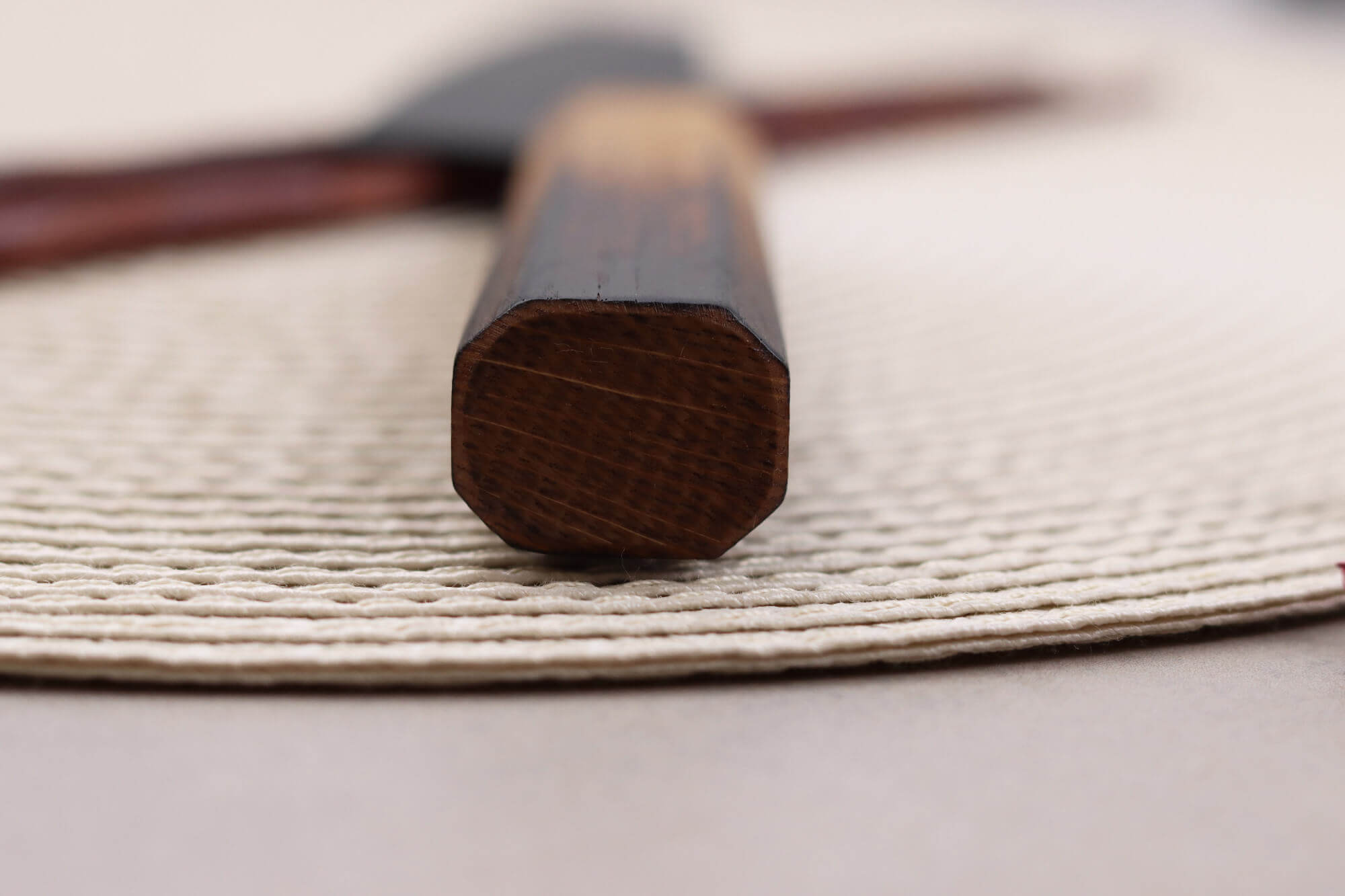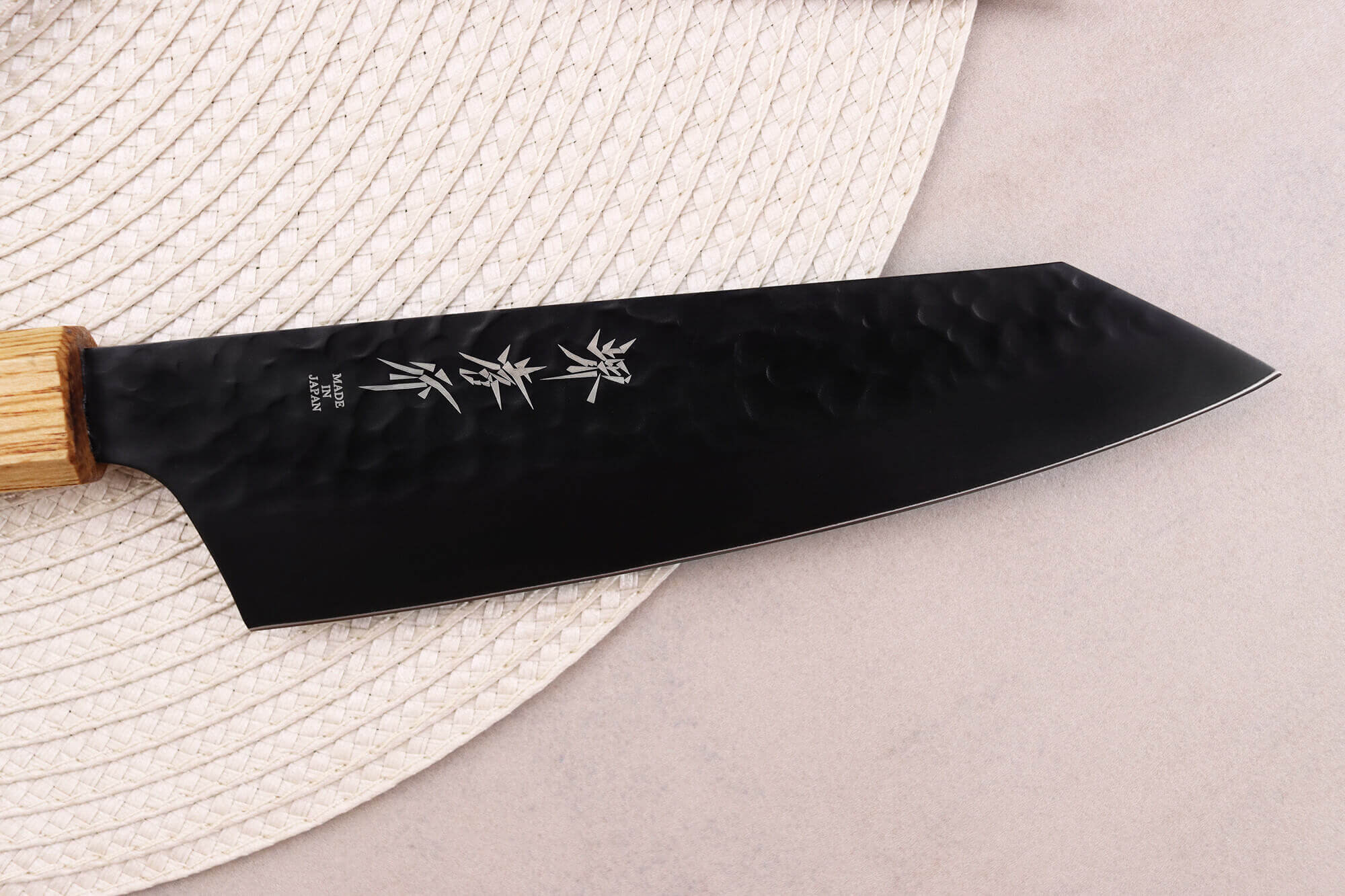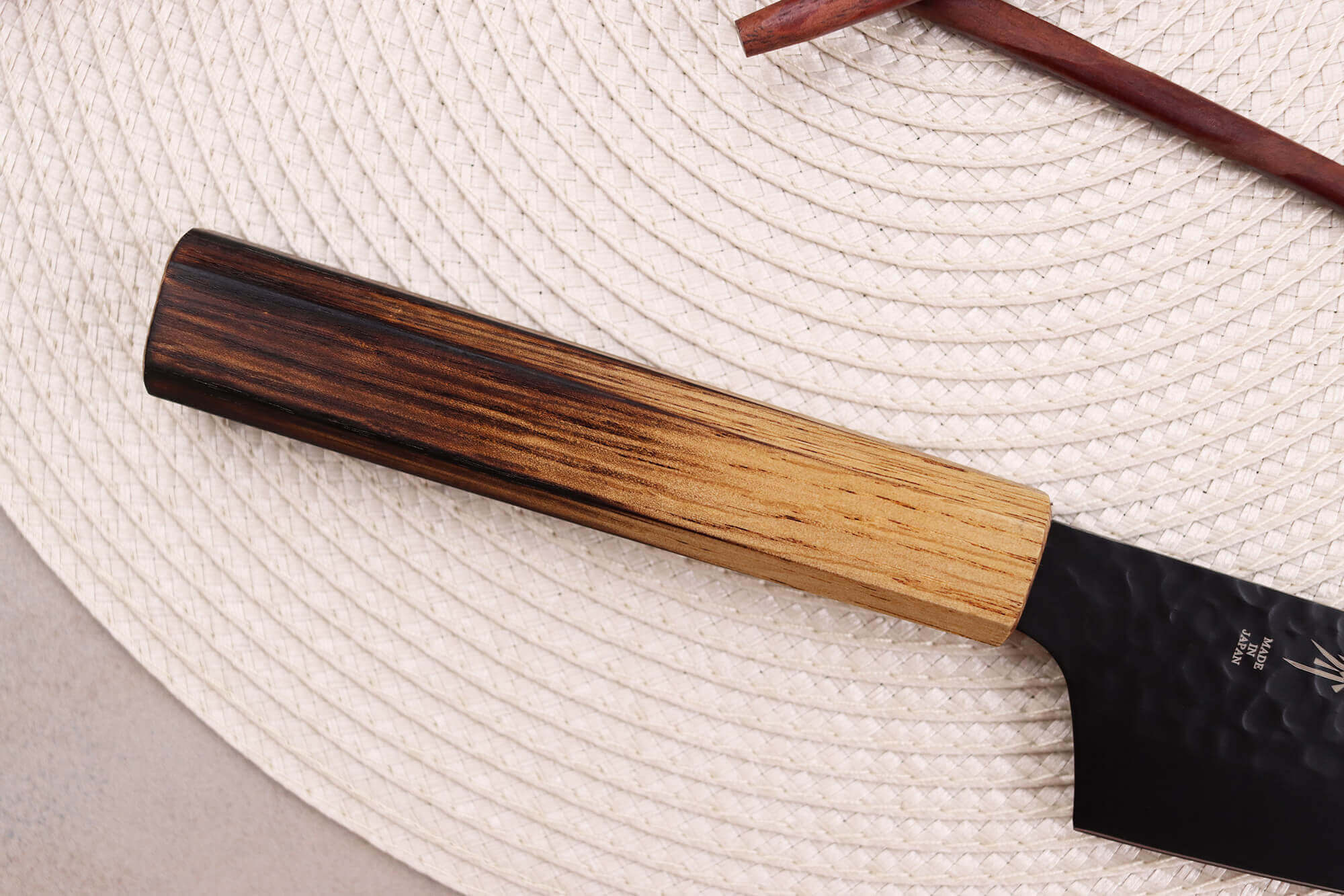 Le manche de ce couteau kiritsuke est doté d'un manche en chêne, une essence durable également utilisée en ébénisterie pour ses nombreux avantages. Le chêne ne se déforme en effet pas facilement, il résiste à l'humidité, aux chocs et aux vibrations. Il convient donc idéalement pour un usage en cuisine. Ici, l'extrémité du manche a été brûlée afin d'accroître sa résistance et de lui apporter un aspect très original.