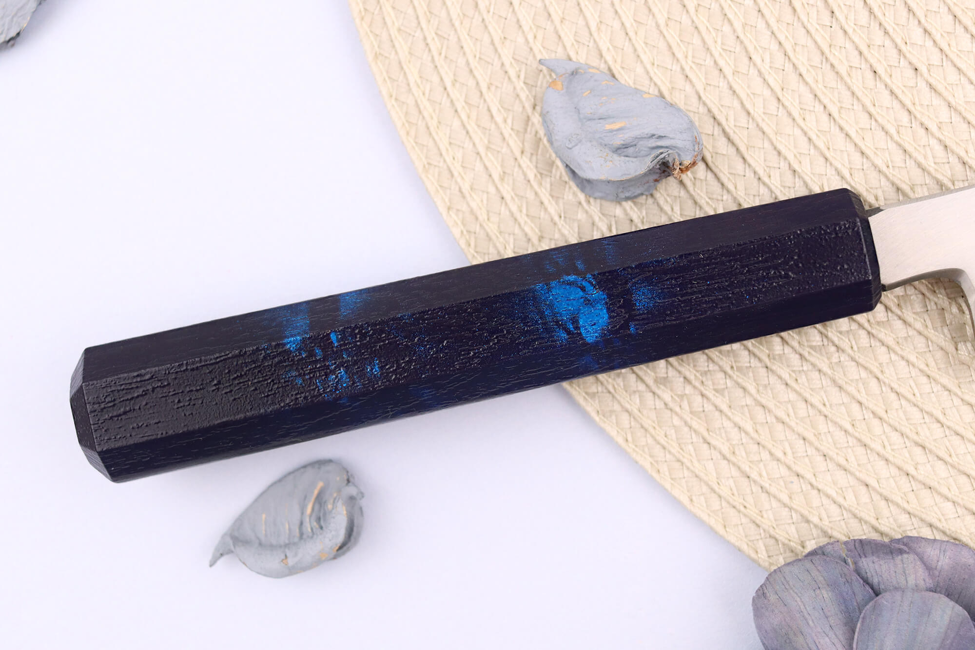 Lavez ce couteau japonais de cuisine uniquement à la main avec un savon doux et une éponge non abrasive. Ne jamais le passer au lave‑vaisselle ni le laisser tremper. Séchez immédiatement afin d’éviter toute oxydation ou dégradation du manche, puis rangez-le dans un endroit sec.
