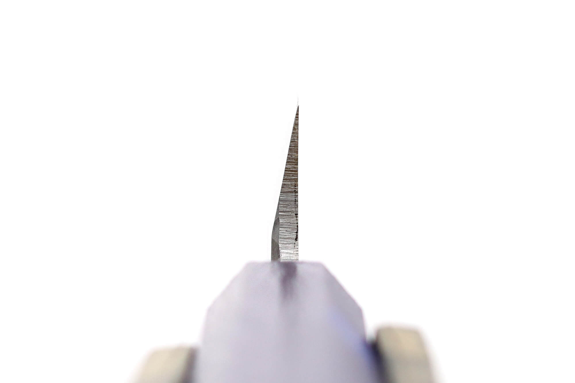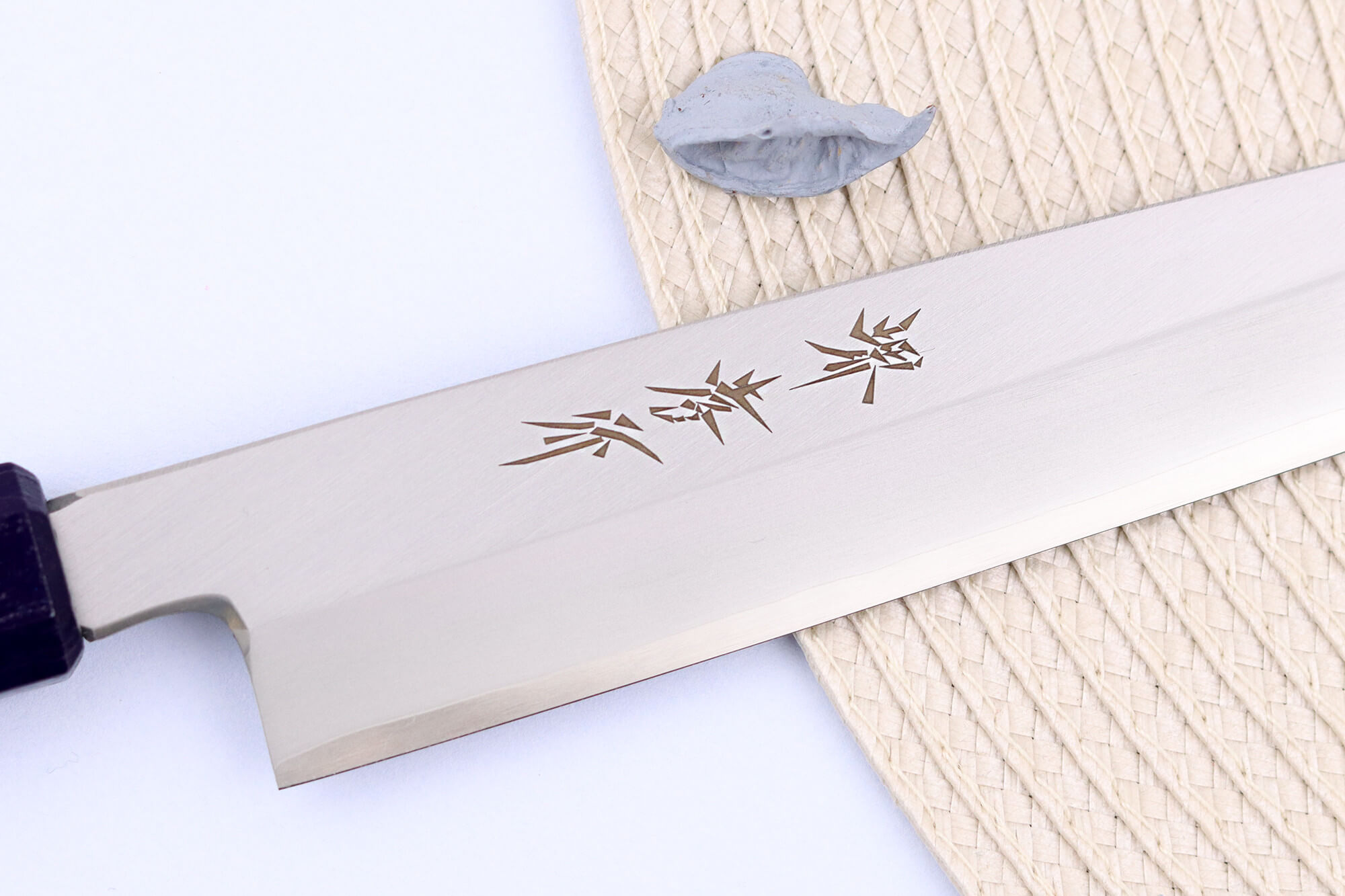 La lame est aiguisée d’un seul côté comme la plupart des couteaux yanagiba. Cette émouture asymétrique est destinée aux cuisiniers droitiers, ce qui permet de couper très fin pour les sashimis ou filets.
