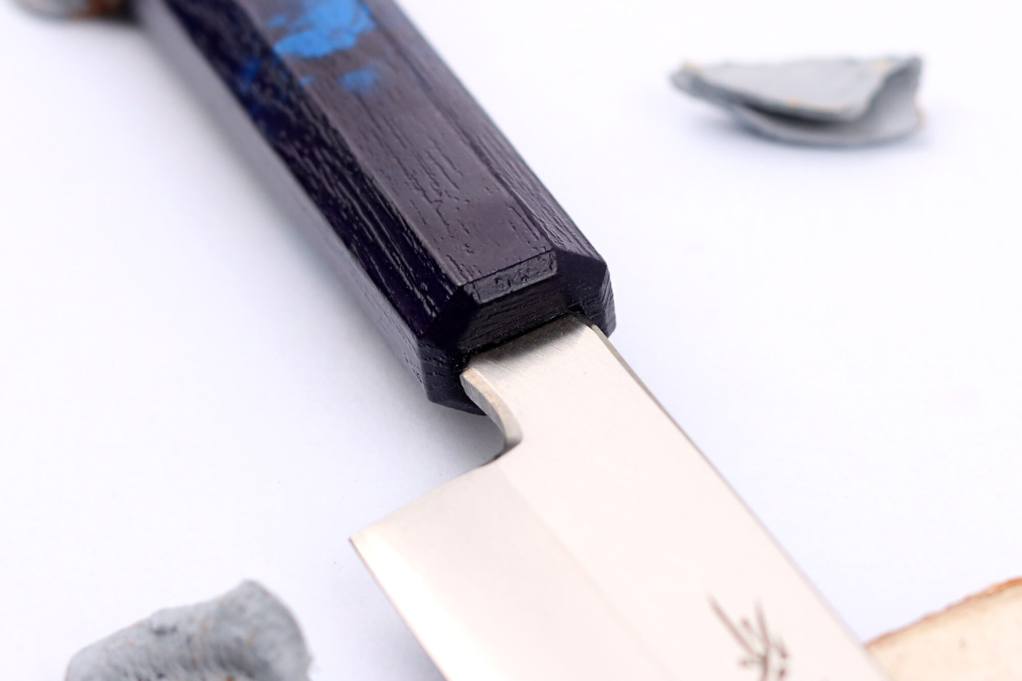 Le machi à l'endroit où la lame rejoint le manche est laissé légèrement apparent, c'est une caractéristique traditionnelle de Sakai qui contribue au bon équilibre du couteau.