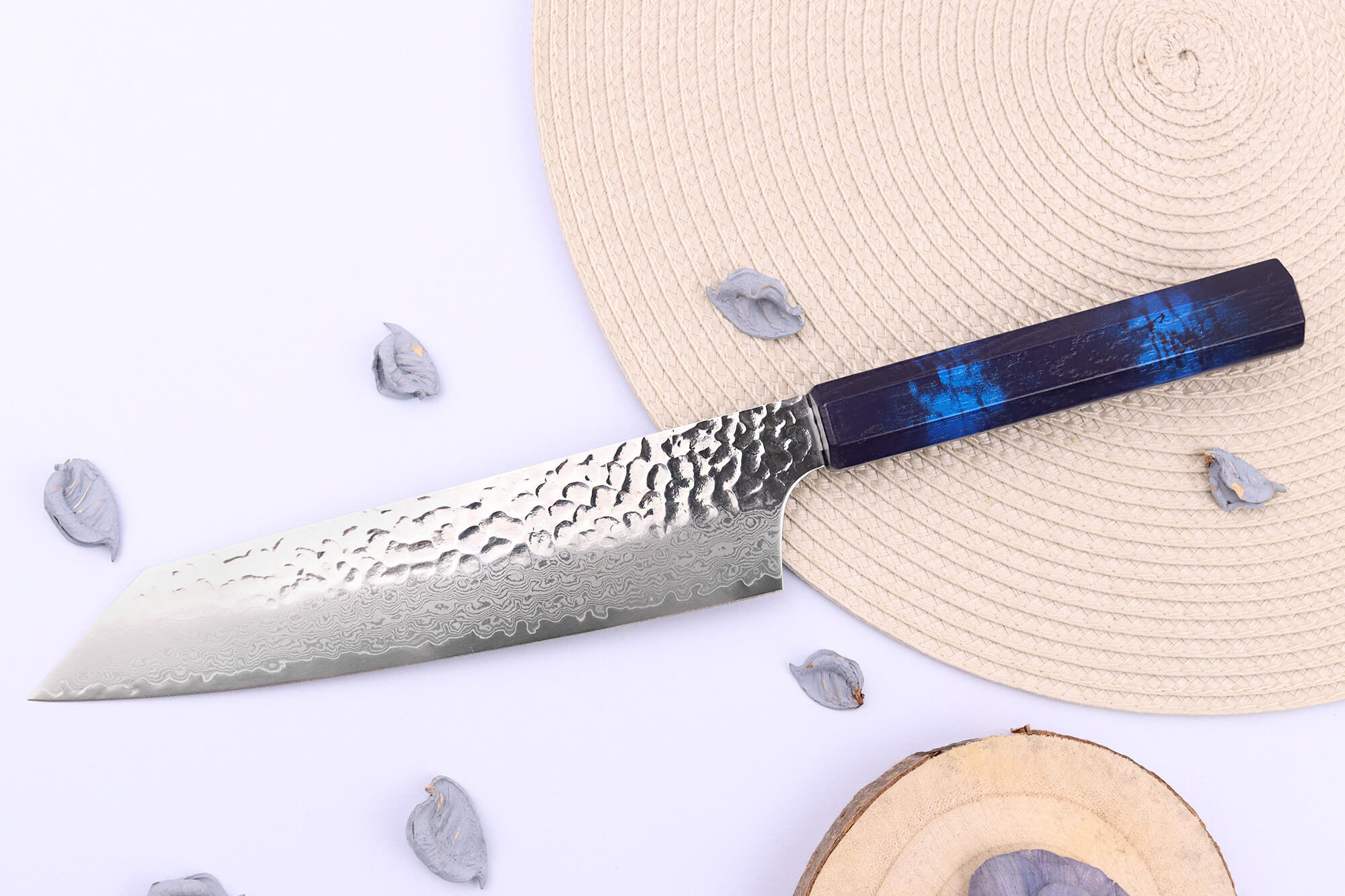 L’ensemble des 33 couches d’acier inox damassé offre non seulement une protection structurelle supplémentaire, mais aussi un visuel unique : chaque lame est ornée de motifs ondulés élégants, différents d’un couteau damas à l’autre. Le travail de la lame ne s’arrête pas là : elle est polie pour obtenir une finition miroir, brillante et raffinée, et martelée, ce qui accentue encore son style authentique. Le martelage ne se limite pas à l’esthétique : il crée de légères alvéoles sur la surface, qui permettent aux aliments de se détacher plus facilement pendant la coupe, pour un travail plus fluide et précis.