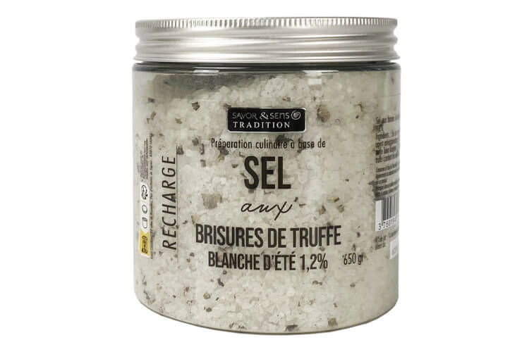 Liste des ingrédients : sel de mer (98%), brisures de truffe Tuber aestivum (1,2%), arôme saveur truffe (0,8%).