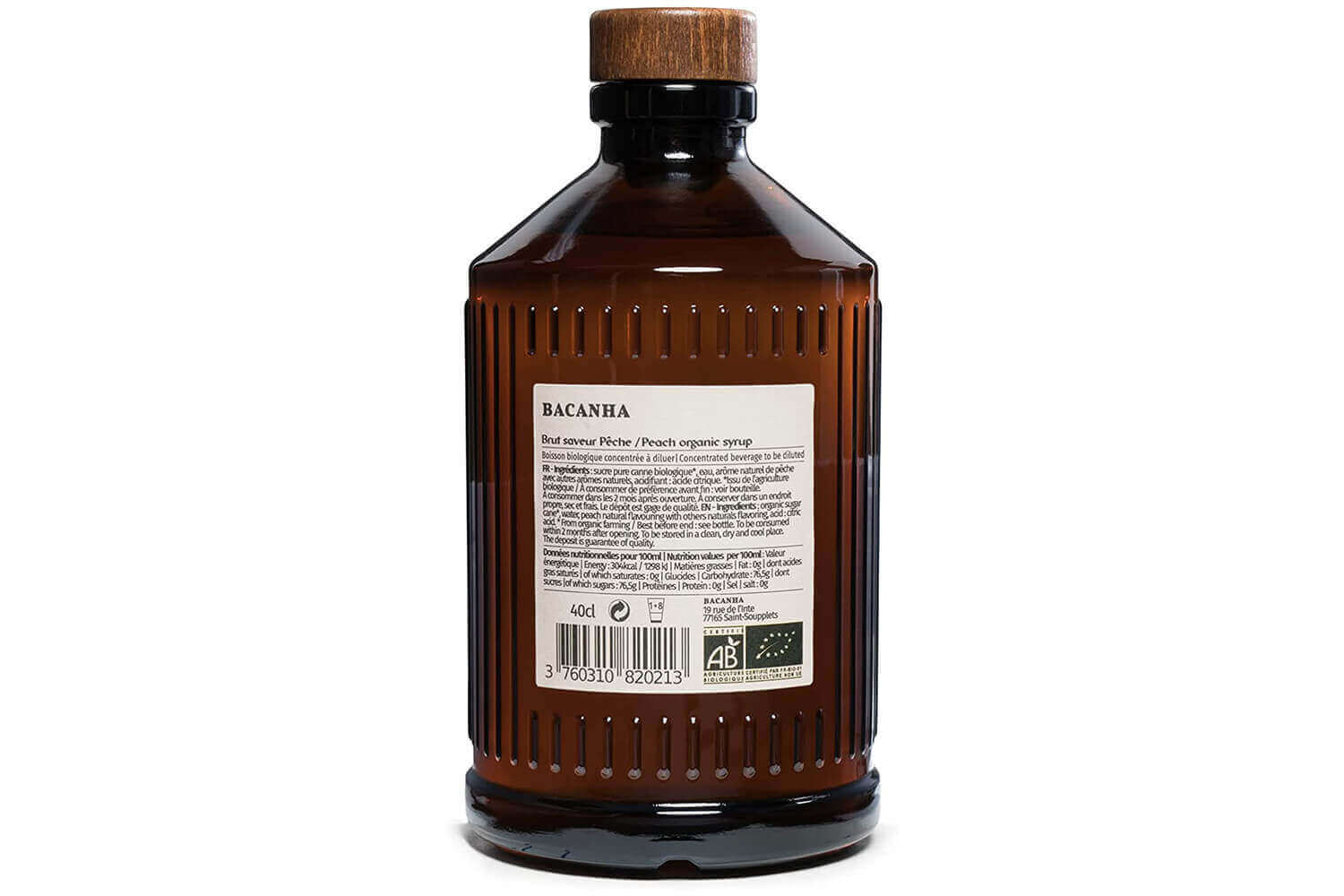 Ingrédients : sucre pure canne biologique, eau, arôme naturel de pêche, jus concentré de citron biologique, acidifiant : acide citrique