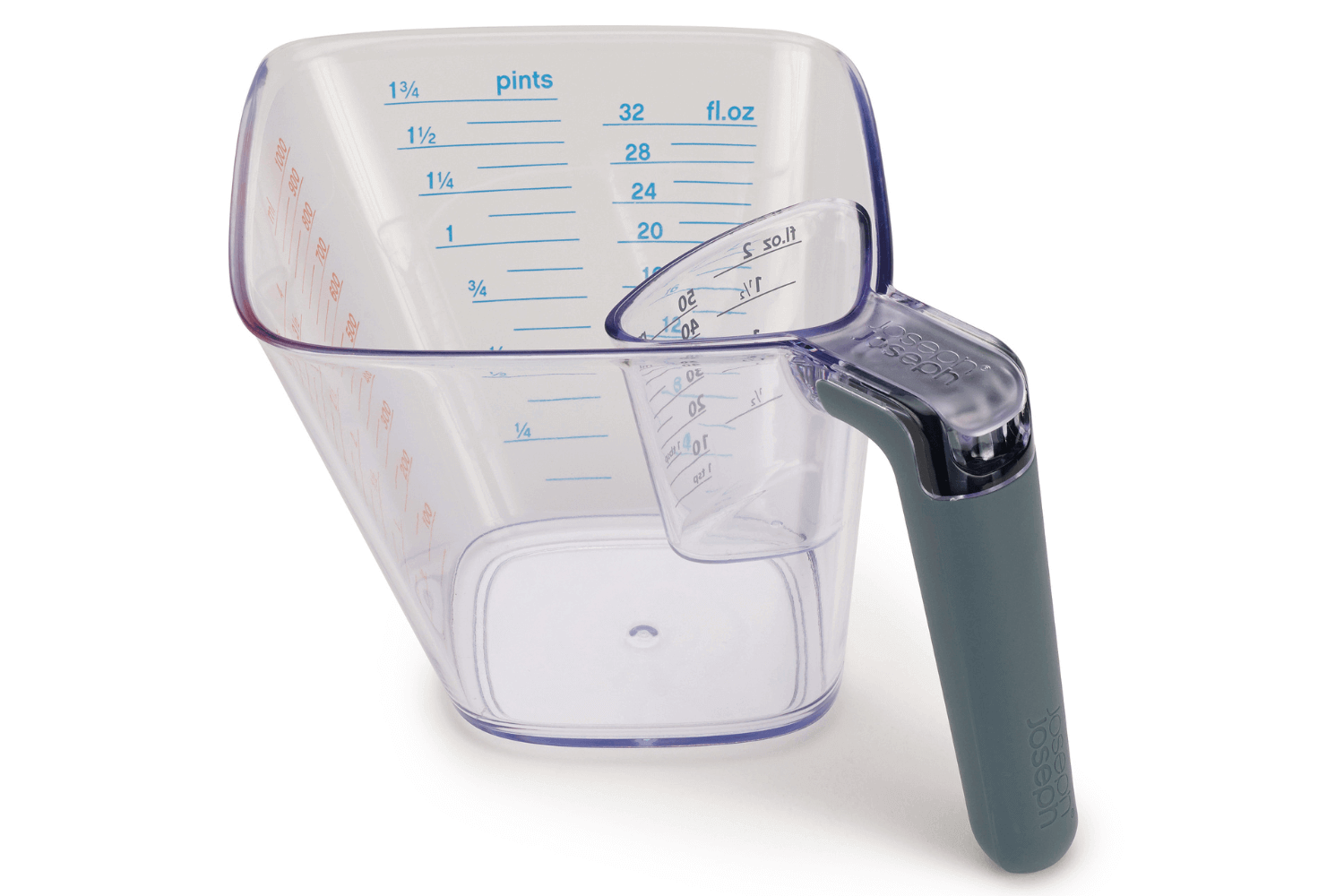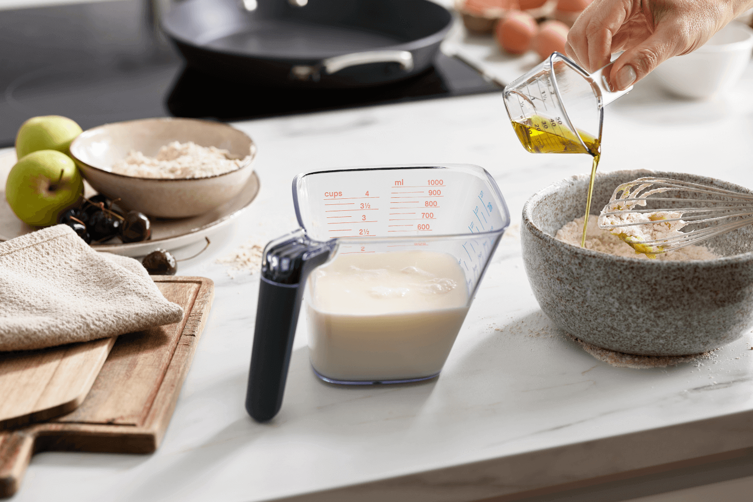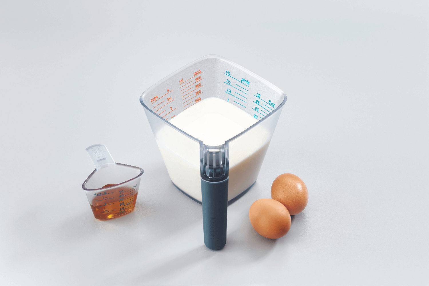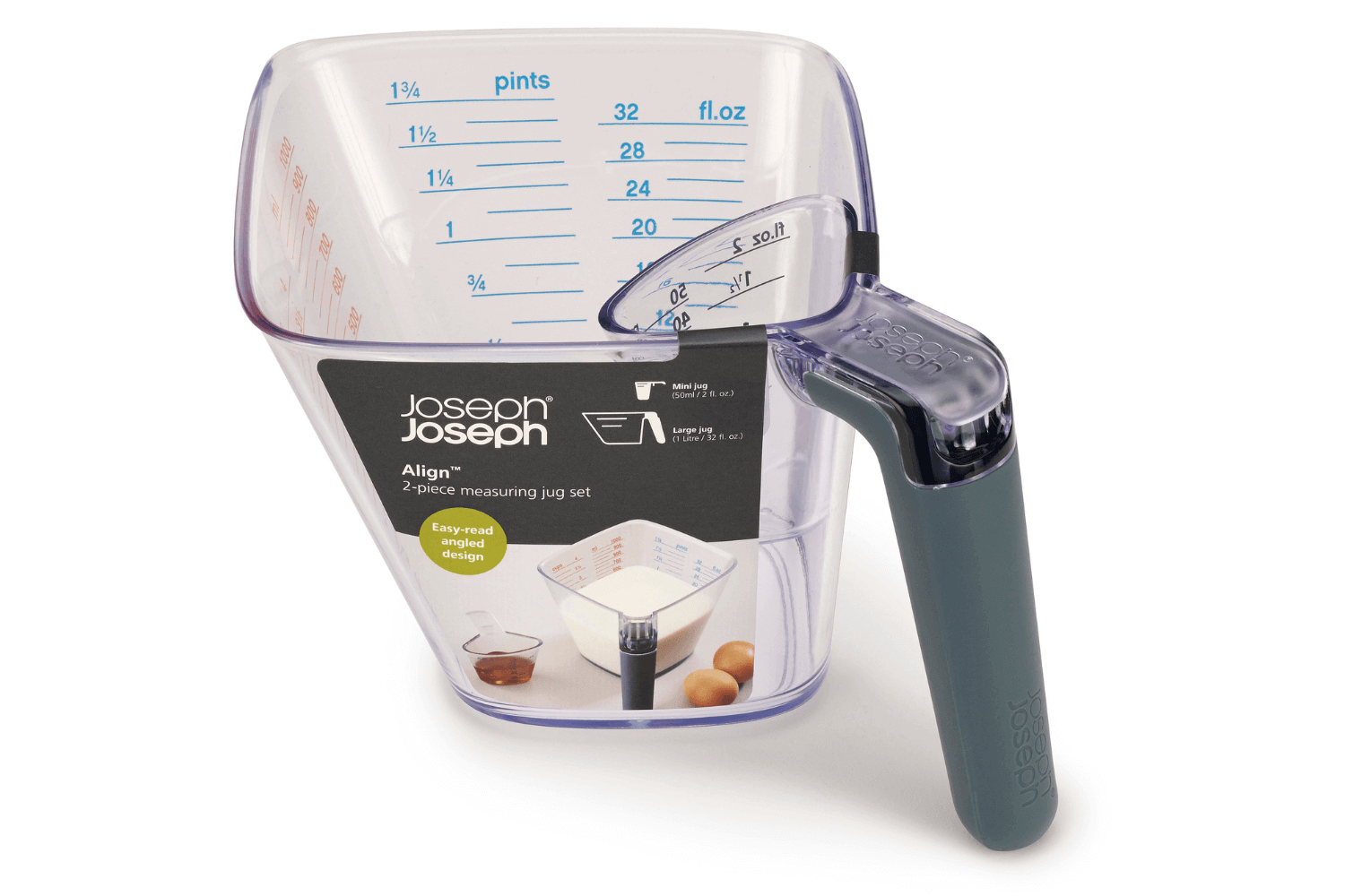 Le doseur Align est capable de mesurer jusqu'à 1L (4 tasses, 1¾ pintes, 32 fl. oz.), ce qui le rend idéal pour une large gamme de recettes, des pâtisseries aux plats mijotés. Pour les plus petites quantités, un récipient de taille réduite accompagne le verre doseur principal, permettant de mesurer des volumes jusqu'à 50ml (2 fl. oz.).