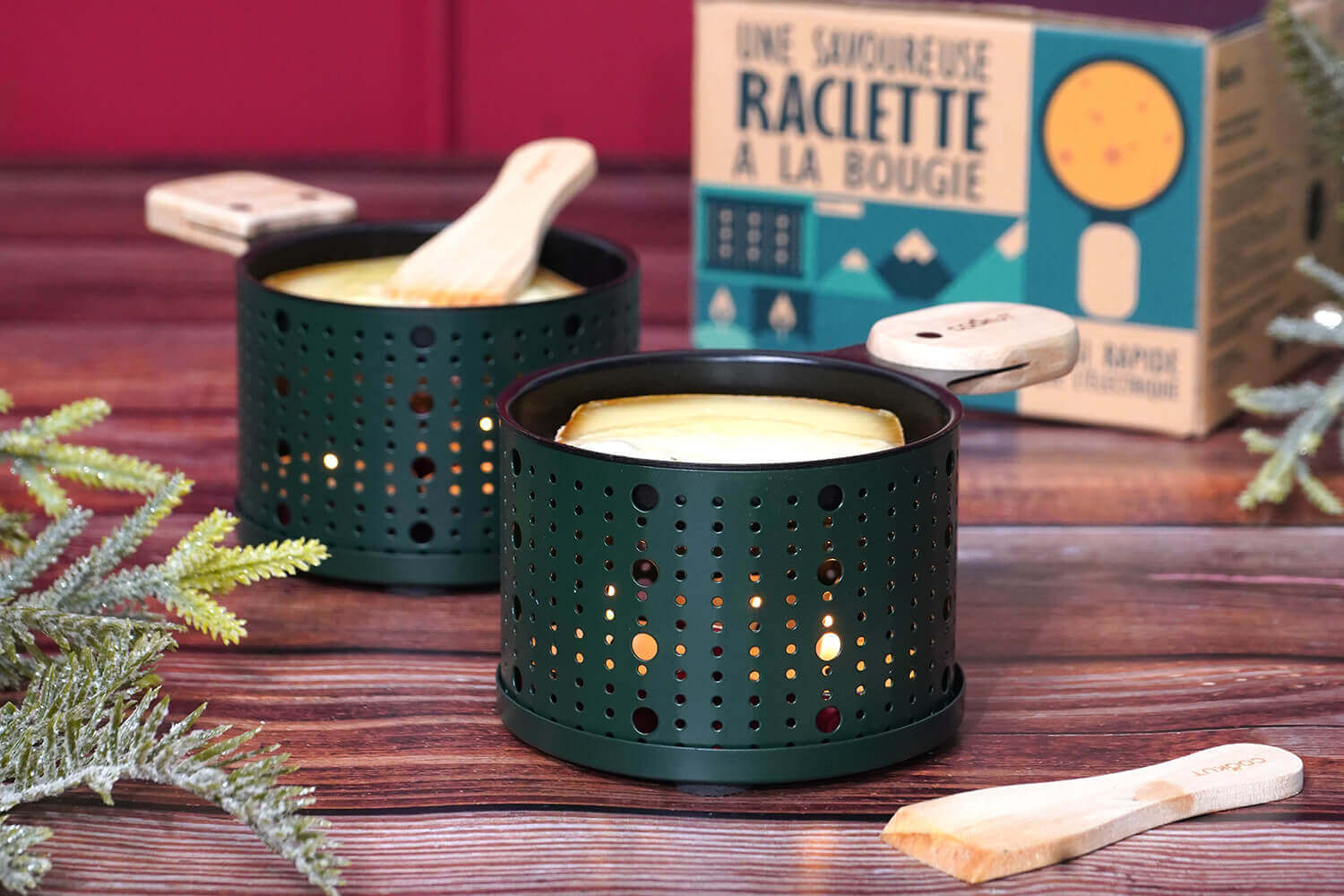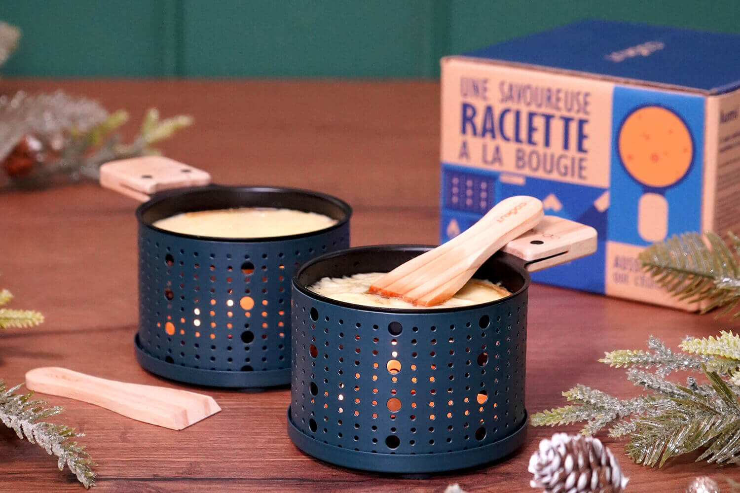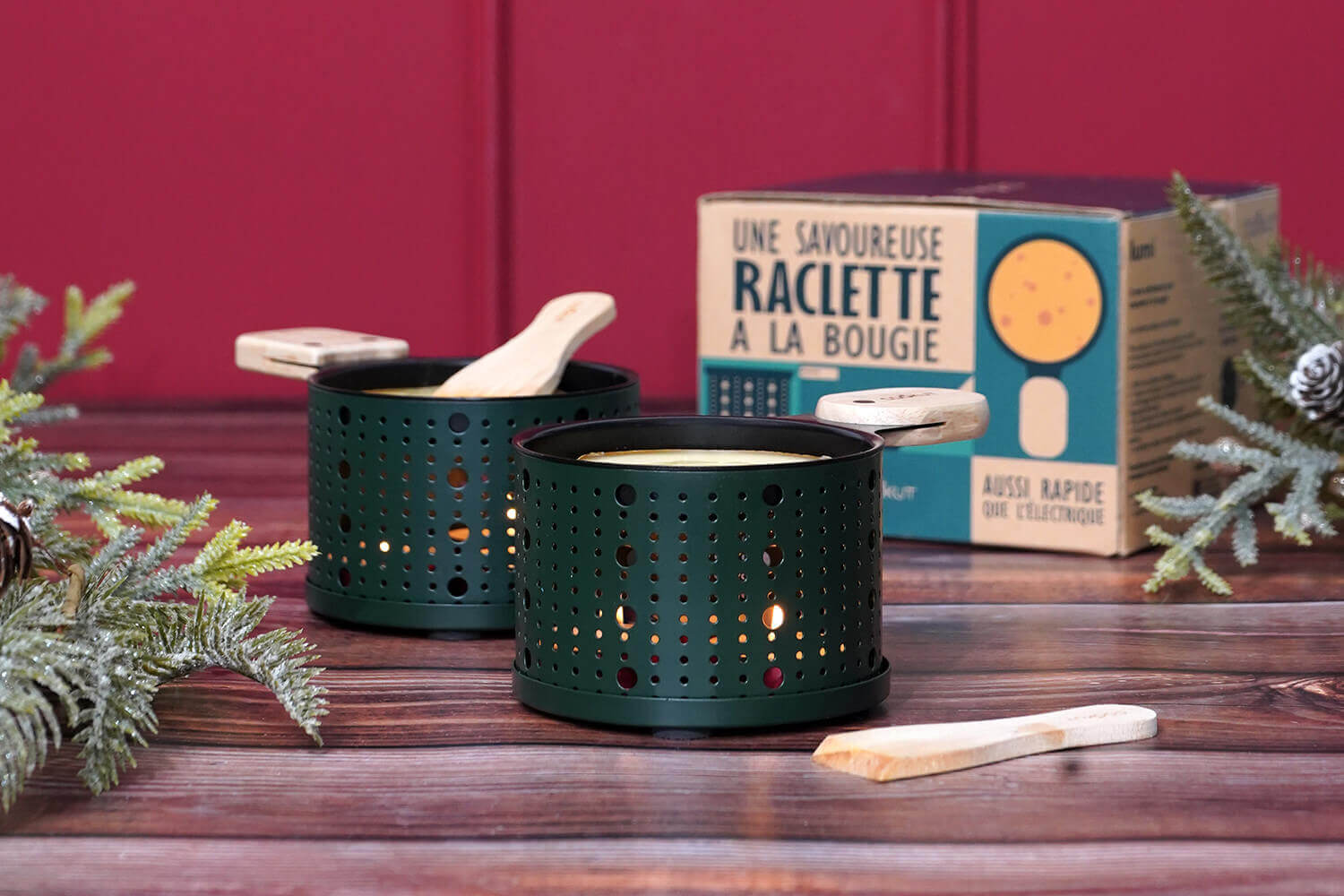 - 2 services à raclettes individuels : Chacun sa raclette, les plus gourmands pourrons la laisser allumée sans émission de chaleur excessive. C'est la raclette version écologique : pas d'électricité, ni de plastique. Elle est simple à installer, il suffit de placer deux à trois bougies dans l'appareil. Le fromage fond aussi rapidement qu'avec un appareil classique : 3 minutes avec 2 bougies, 1 minute avec 3 bougies.
