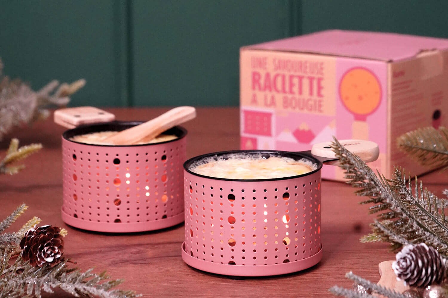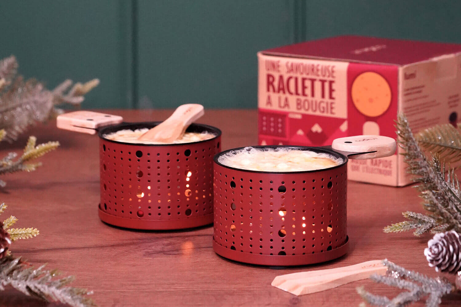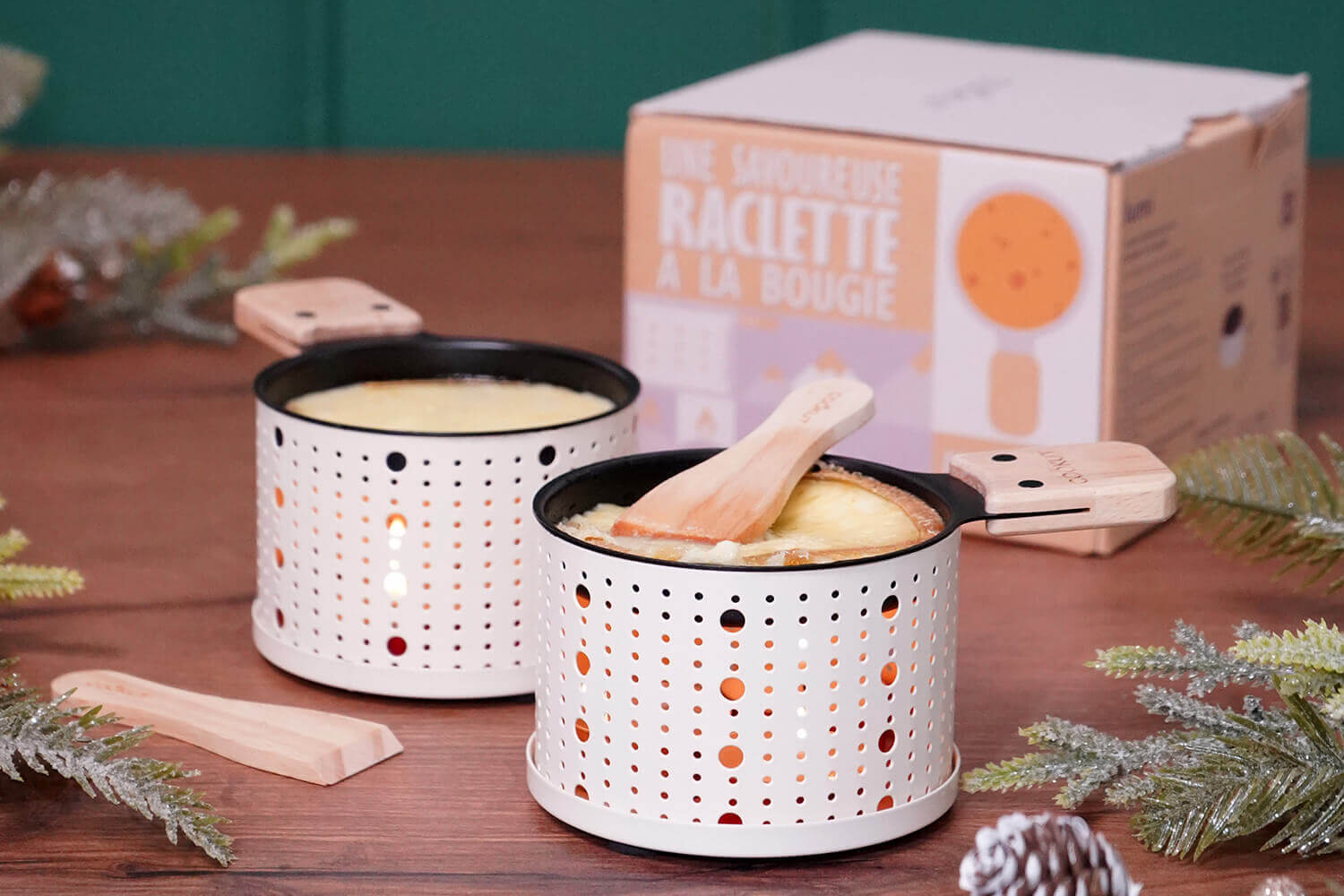 - 2 services à raclettes individuels : Chacun sa raclette, les plus gourmands pourrons la laisser allumée sans émission de chaleur excessive. C'est la raclette version écologique : pas d'électricité, ni de plastique. Elle est simple à installer, il suffit de placer deux à trois bougies dans l'appareil. Le fromage fond aussi rapidement qu'avec un appareil classique : 3 minutes avec 2 bougies, 1 minute avec 3 bougies.