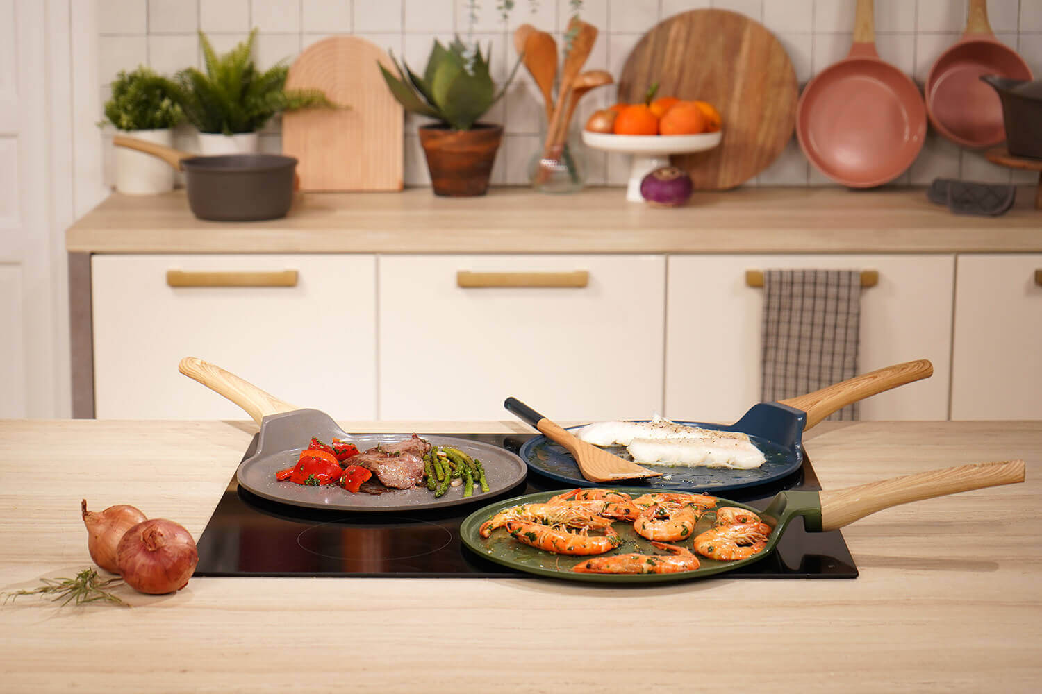 Grâce à l'incroyable poêle plancha et crêpière Cookut, vous avez 3 ustensiles de cuisson en 1 !