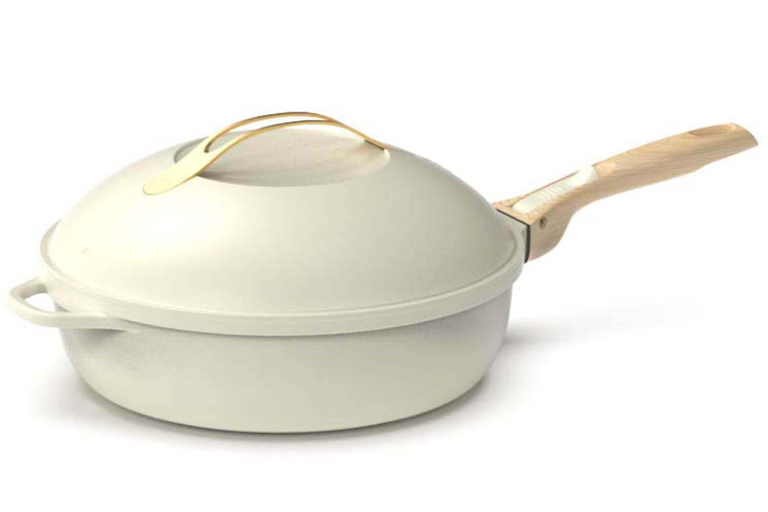 La Fabuleuse est faite dans un ton blanc meringue délicat et élégant, la rendant intemporelle. Même si la poêle peut passer de temps en temps au lave-vaisselle, il est recommandé par Cookut de la nettoyer à la main au quotidien. N'utilisez jamais d'éponge abrasive ni d'ustensiles en métal qui pourraient abîmer son revêtement.