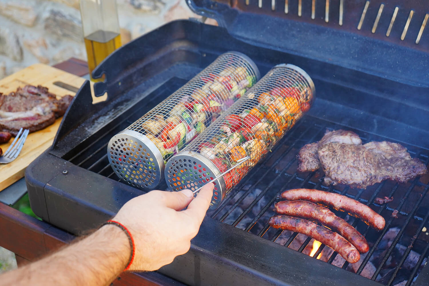 Les grilles de cuisson Roll Grill de Cookut sont une solution idéale pour cuisiner les tous petits aliments au barbecue ! Leur maillage fin évite qu'ils ne tombent dans les flammes, tout en leur assurant une cuisson parfaite. Il vous suffit de les introduire crus dans une grille ou de les faire mariner au préalable, de refermer la grille et de placer celle-ci sur la grille de votre barbecue. Rien de plus simple !