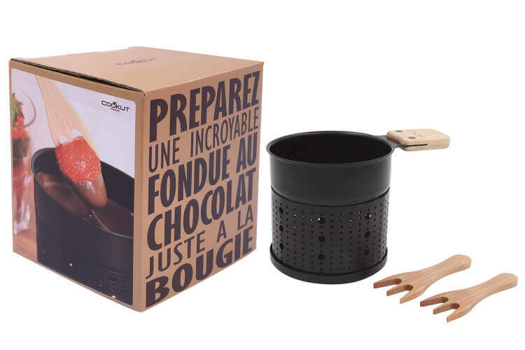 - un caquelon à fondue : à placer au milieu de la table, partagez une délicieuse fondue au chocolat pour 2 ou 3 personnes. Les convives ne sont pas gênés par des fumées excessives, ce modèle écologique fonctionne sans électricité ni plastique. Son utilisation est incroyablement simple : il suffit de placer deux ou trois bougies à l'intérieur, puis de déposer des carreaux de chocolat (au lait, noir, aux noisettes...) à l'intérieur. Aussi efficace qu’un appareil traditionnel, il fait fondre le chocolat en un temps record : trois minutes avec deux bougies, ou seulement une minute avec trois bougies !