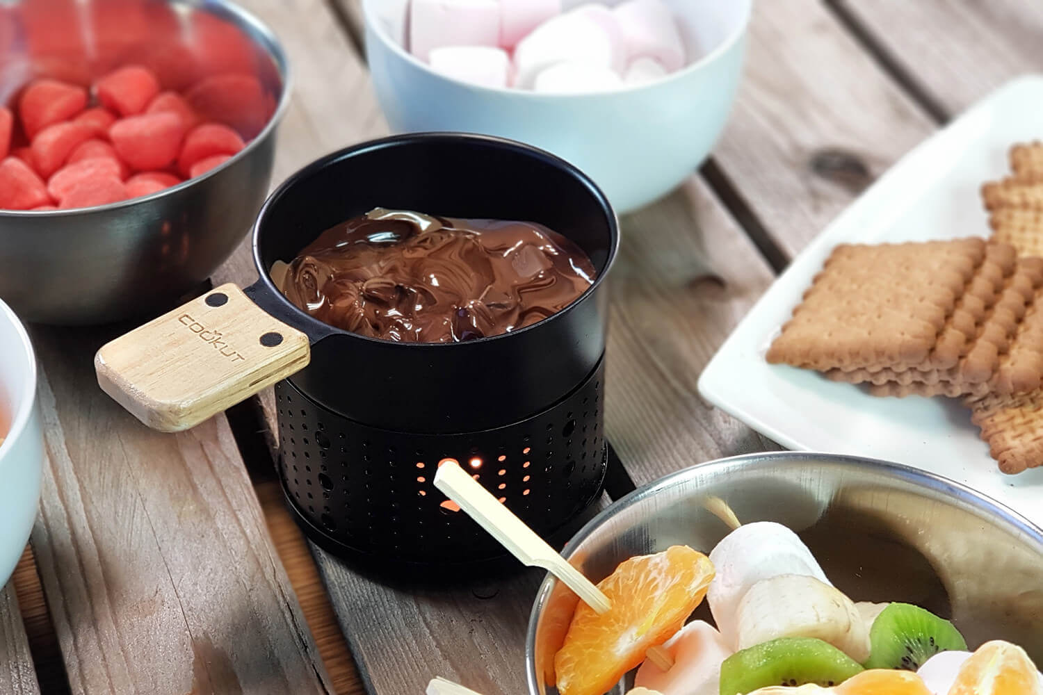 Léger et compact, ce set fondue au chocolat Cookut tient facilement dans un sac à dos. Chacun peut déguster ses fruits enrobés de chocolat à son propre rythme, en toute autonomie.