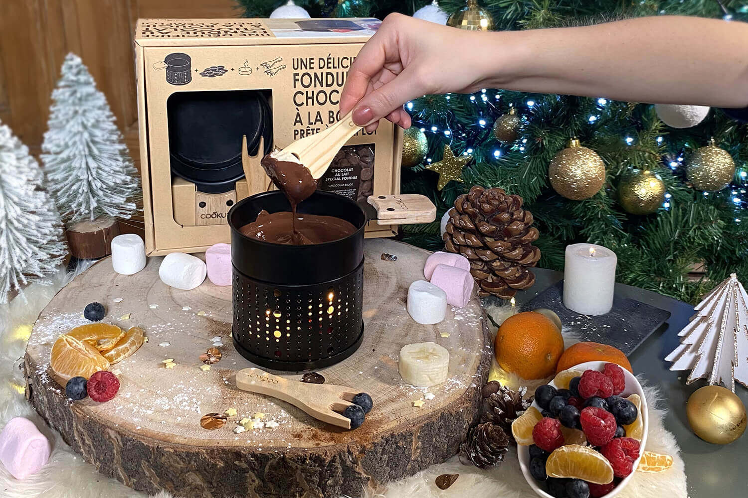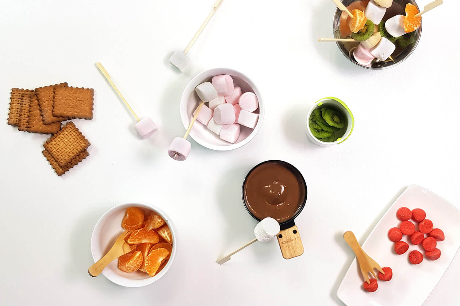 - deux fourchettes en bois : indispensables pour plonger les fruits, guimauves ou encore biscuits dans le chocolat fondu. Pourquoi ne pas également composer de délicieuses brochettes mixtes à enrober de chocolat ?