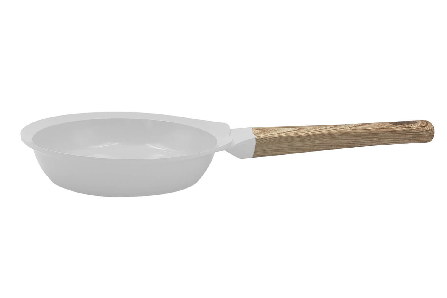 La poignée est fabriquée en polymères à la couleur du bois pour un excellent contraste avec la poêle au coloris blanc polaire. Facile à manipuler, ce manche assure une prise en main sécurisée. De plus, un œillet est disponible à l'arrière du manche pour suspendre votre poêle dans la cuisine.
