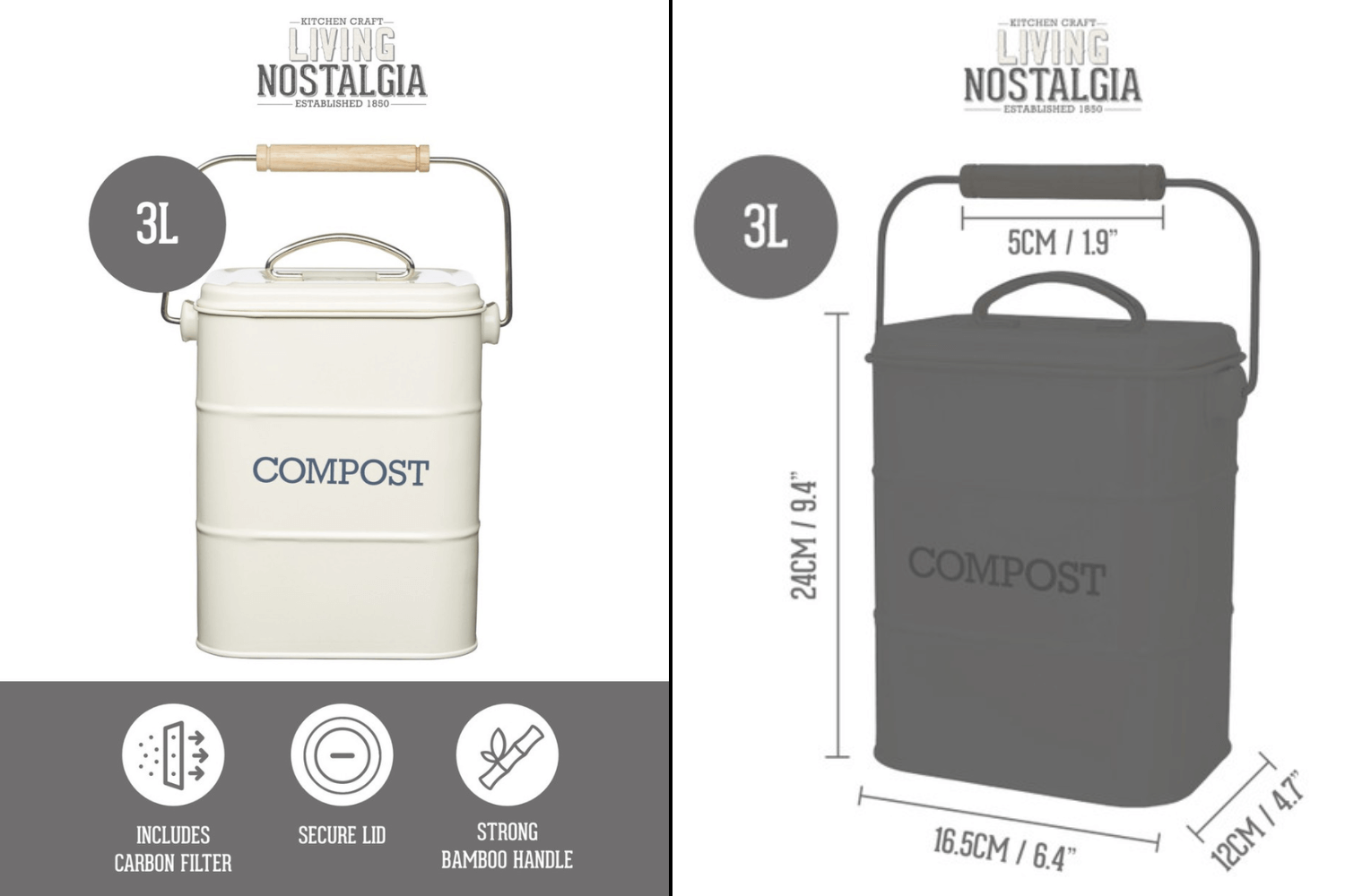 Côté conception, ce bac à compost Living Nostalgia est fabriqué en acier de qualité supérieure. Sa forme en seau facilite grandement son port et sa pose. Son couvercle hermétique travaille en binôme avec le filtre à charbon pour éviter la propagation des mauvaises odeurs, et optimiser la décomposition des déchets. Sa longue anse, combinée avec sa poignée en bambou, assure une prise en main confortable. Enfin, la poignée ergonomique en acier sur son couvercle simplifie son ouverture et sa fermeture.