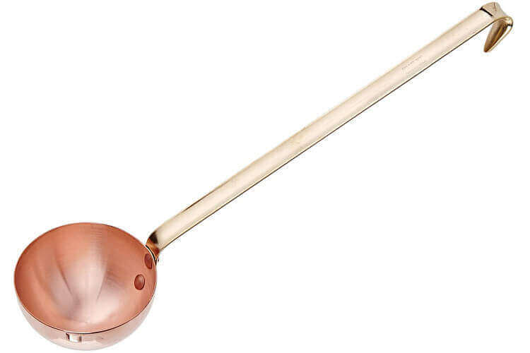 Le cuivre est réputé pour son excellente conduction et répartition thermique. Les cuissons sont rapides et uniformes. Dans le cas d'une louche, son aspect conservateur de chaleur est idéal car la louche empêche vos préparations chaudes de refroidir.