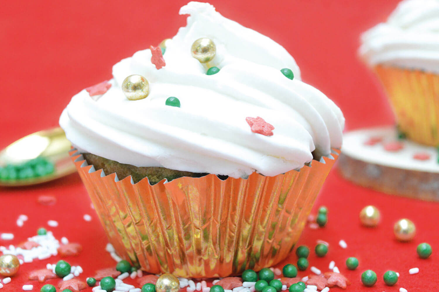Assortiment 4 décors : perles dorées, étoiles rouges, billes vertes, vermicelles blancs