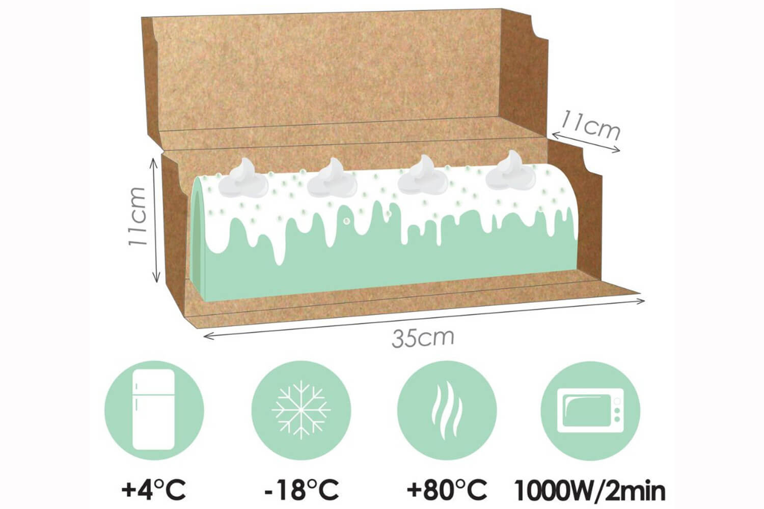Ces boîtes à bûches résistent à des températures de -18°C à +80°C, vous pouvez les mettre au réfrigérateur (max +4°C), au congélateur (max -18°C), et les passer au four (max +80°C) et au micro-ondes (max 2min à 1000W).