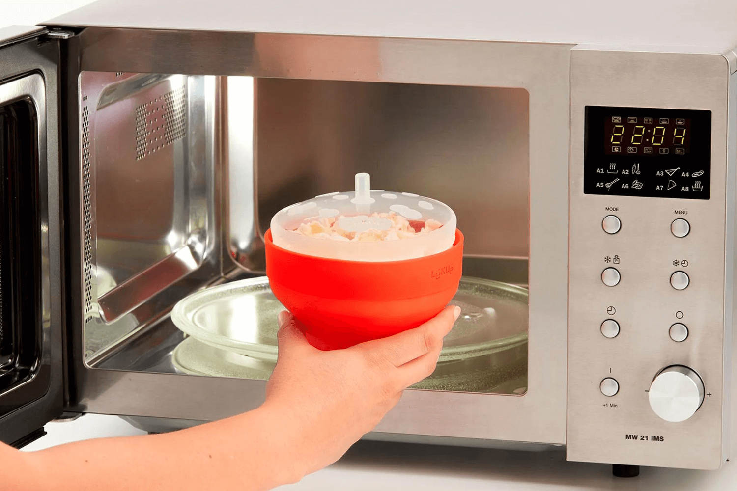 Comment utiliser votre bol popcorn Lékué ? Dépliez le bol et ajoutez 20g de grains de maïs. Ensuite, ajoutez une noisette de beurre ou une cuillère à soupe d'huile. Faites cuire au micro ondes à puissance maximale (800W) pendant 1 à 2 min et c'est prêt ! À vous les home cinéma entre amis ou en famille.