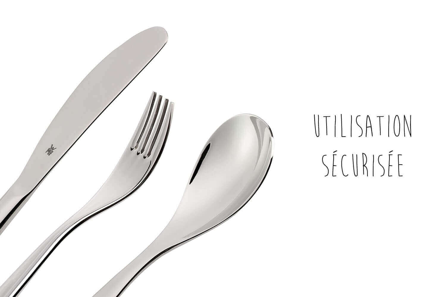 L'utilisation des couverts est sécurisée pour votre enfant, ils ne présentent aucun risque de blessure. La lame du couteau est légèrement crantée, les petites dents de la fourchette sont émoussées et les arêtes des cuillères sont arrondies.