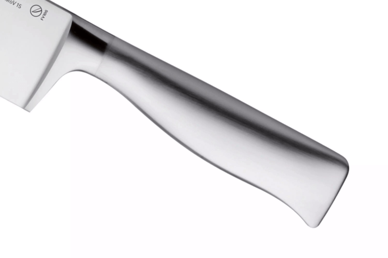 Le couteau de chef WMF Grand Gourmet présente une poignée en acier inox 18/10 avec des courbes assurant ergonomie et confort à son utilisateur. Sa forme procure une préhension fiable, garantissant un maniement précis et sans efforts au moment de la coupe.