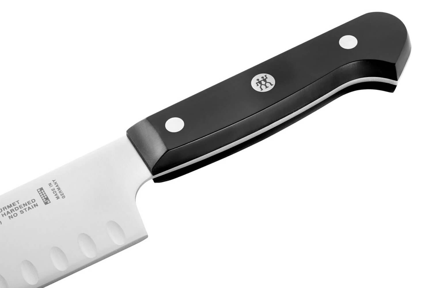 Ce couteau santoku Zwilling Gourmet correspond au couteau de chef occidental, mais il présente une forme typiquement japonaise. Il permet ainsi de varier les découpes et il est particulièrement apprécié pour ciseler les fines herbes du fait de sa lame légèrement courbée. Le fait que celle-ci soit également alvéolée garantit une anti adhérence accrue de la surface de coupe.
